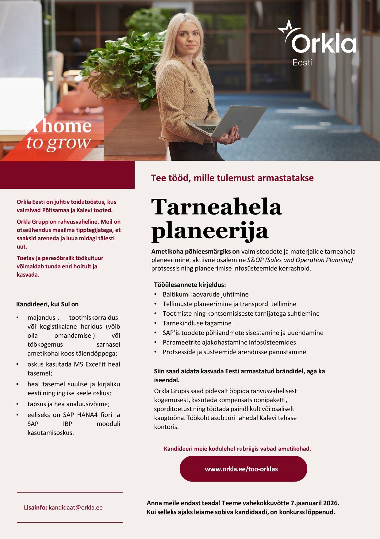 Orkla Grupis saad pidevalt õppida rahvusvahelisest kogemusest, kasutada kompensatsioonipaketti, sporditoetust ning töötada paindlikult või osaliselt kaugtööna. Töökoht asub Jüri lähedal Kalevi tehase kontoris.