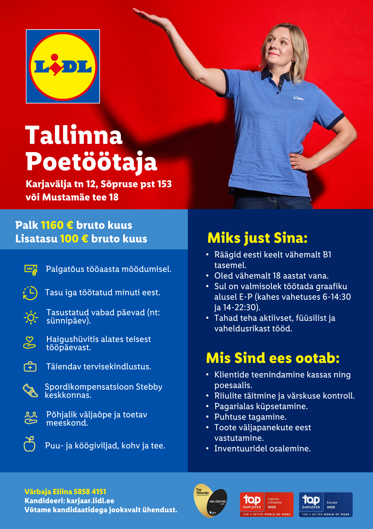 Oled Sa mõelnud karjäärist rahvusvahelises meeskonnas, kus iga päev panustad Euroopa suurima jaekaubandusketi tegevuse alustamisele Eestis? Kas otsid töökohta, kus ei oodata niivõrd aastatepikkuseid kogemusi valdkonnas, vaid pigem soovi areneda, head õpivõimet ning tegutsemissoovi? Lidlis on see kõik võimalik!Oleme edukas jaemüügikett, mis laieneb jõudsalt üle maailma ning pakub uut tüüpi ostukogemust juba 31 riigis. Meil on üle 11 900 kaupluse ning üle 200 logistikakeskuse, mis teeb meist suurima jaeketi Euroopas.