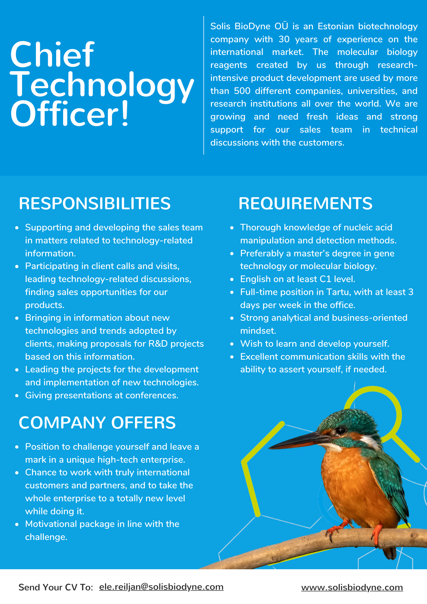 Solis BioDyne OÜ is an Estonian biotechnology company with 30 years of experience on the international market. The molecular biology reagents created by us through research-intensive product development are used by more than 500 different companies, universities, and research institutions all over the world. We are growing and need fresh ideas and strong support for our sales team in technical discussions with the customers.