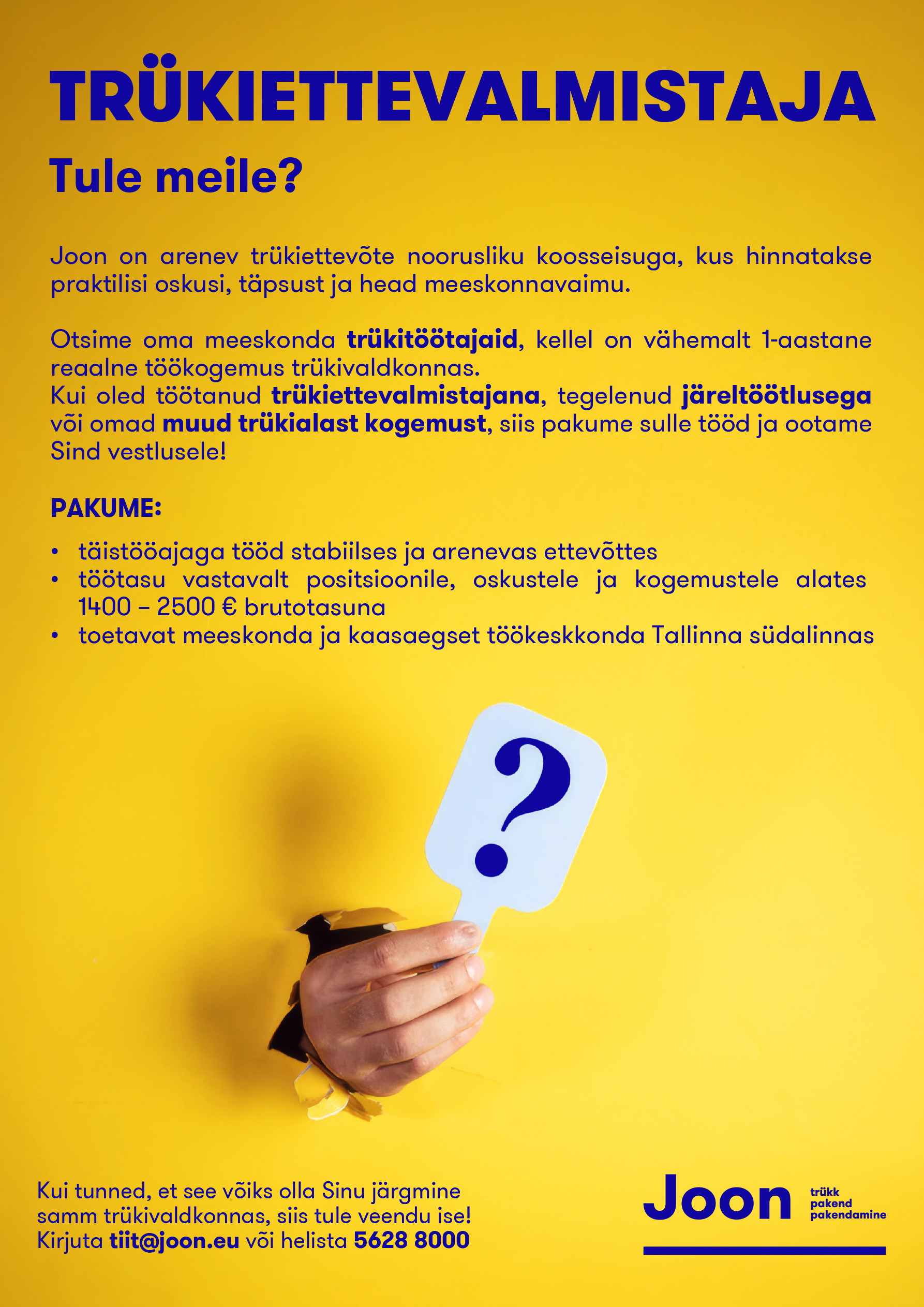 Joon asutati aastal 2005, et pakkuda klientidele kõige sobivamaid ja kvaliteetsemaid trükilahendusi. Meile meeldisid siis ja meeldivad tänaseni protsessid, mille tulemust on võimalik silmaga mõõta. Panustame oma inimestesse ja investeerime uutesse tehnoloogiatesse, et saaksime koos teha seda, mis meil silma särama paneb me loome uudsust ja toodame kvaliteeti.