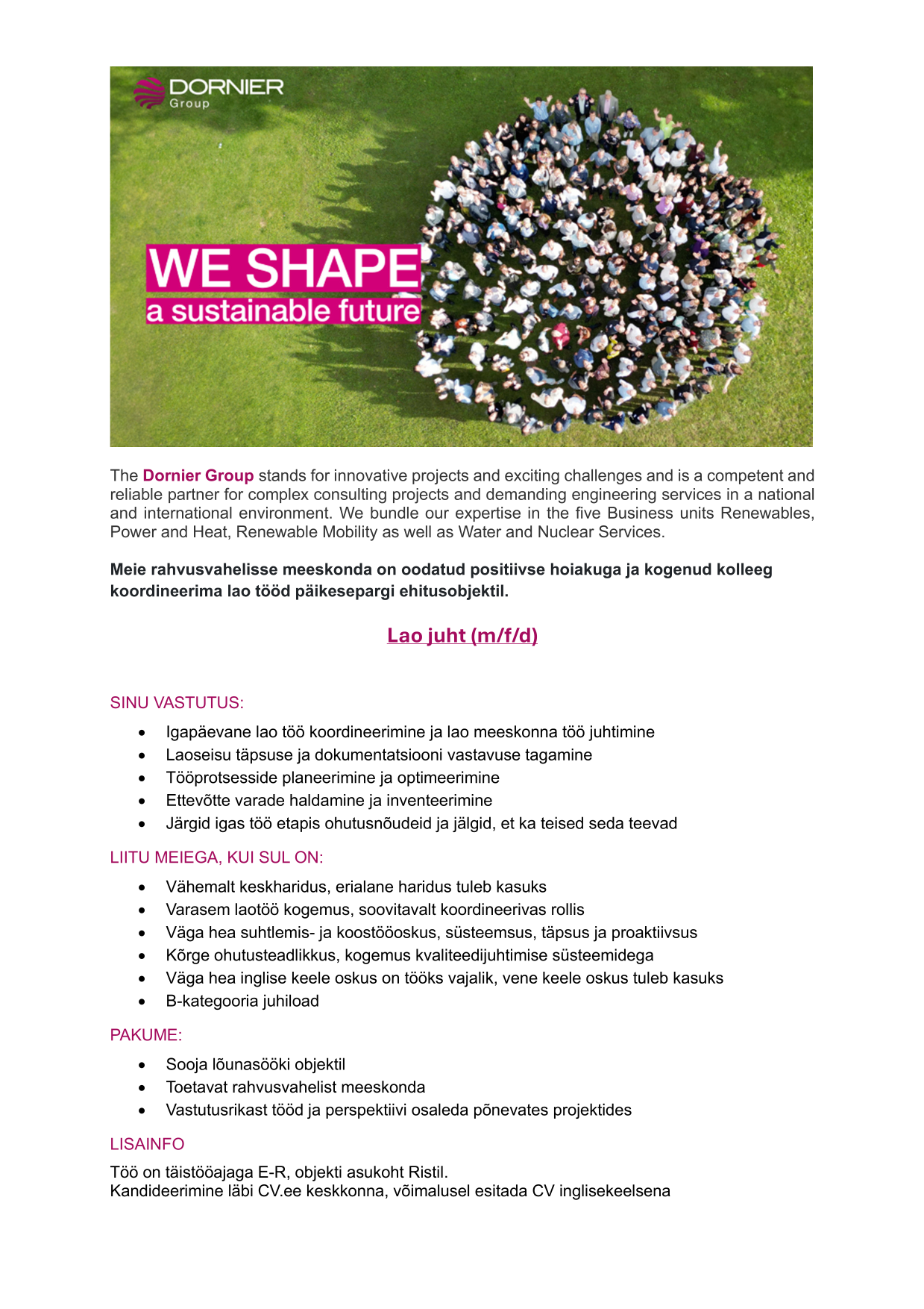 Lisahüved: • Soe lõunasöök objektil • Toetav rahvusvaheline meeskond • Vastutusrikas töö ja perspektiiv osaleda põnevates projektides