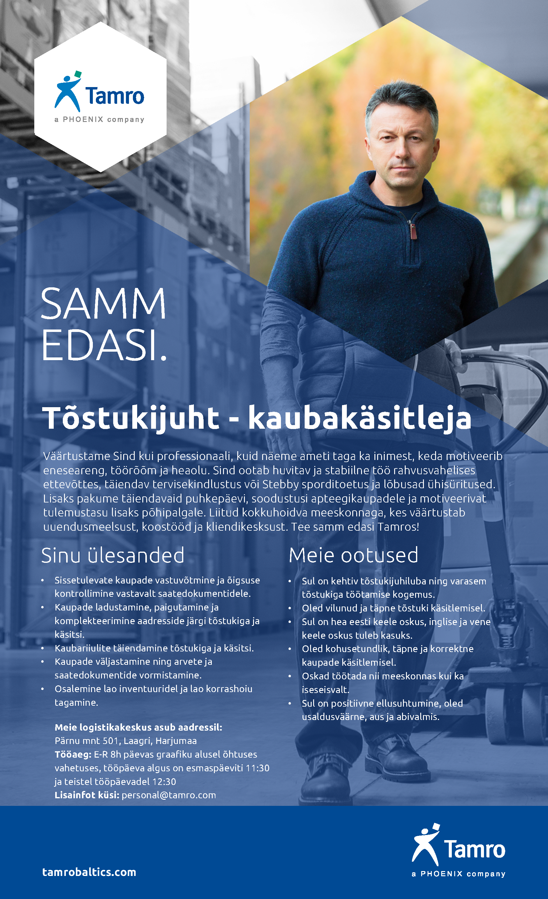 Tamro Baltics on Baltimaade suurim ravimite hulgi- ja jaemüügiettevõte. Meil on Balti riikides ligi 1200 töötajat. Koos frantsiisidega kannab BENU nime ligi 500 apteeki Eestis, Lätis ja Leedus. Tamro Baltics kuulub PHOENIX gruppi, kes tegeleb ravimite turustamisega 29-s Euroopa riigis. Me aitame inimestel olla tervemad ja elada paremat elu. Meie missioon on pakkuda pidevalt ja kvaliteetselt ravimeid, tervisetooteid ja teenuseid, et inimesed saaksid elada täisväärtuslikumat elu. Tamro on tegutsenud Eesti ravimiturul üle 30 aasta. Teenindame Eestimaa haiglaid ja apteeke, samuti teisi tervishoiuasutusi 8000 m² üldpinnaga kaasaegsest logistikakeskusest Tallinna piirilt Laagrist, kus asub ka meie kontor. Tamro Eestis töötab ligikaudu 190 inimest.