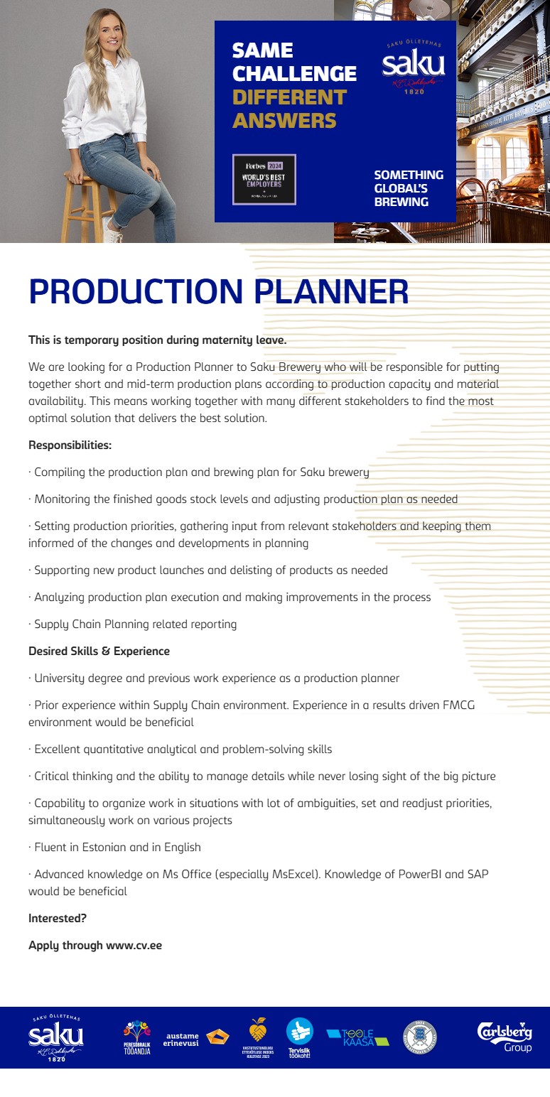 Saku Õlletehase AS-is, Carlsbergi grupi Baltikumi üksuses, ootab sind ees rahvusvahelise joogitööstuse põnev maailm. Siin töötavad oma ala tipptegijad, kes igapäevaselt pingutavad selle nimel, et meie tooted oleksid laitmatu kvaliteediga ja pakuksid unikaalseid maitseelamusi. Meie jaoks on oluline mõelda paremale tänasele ja homsele.