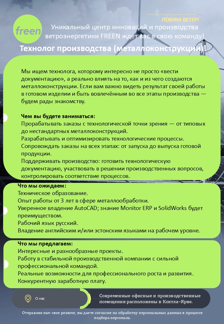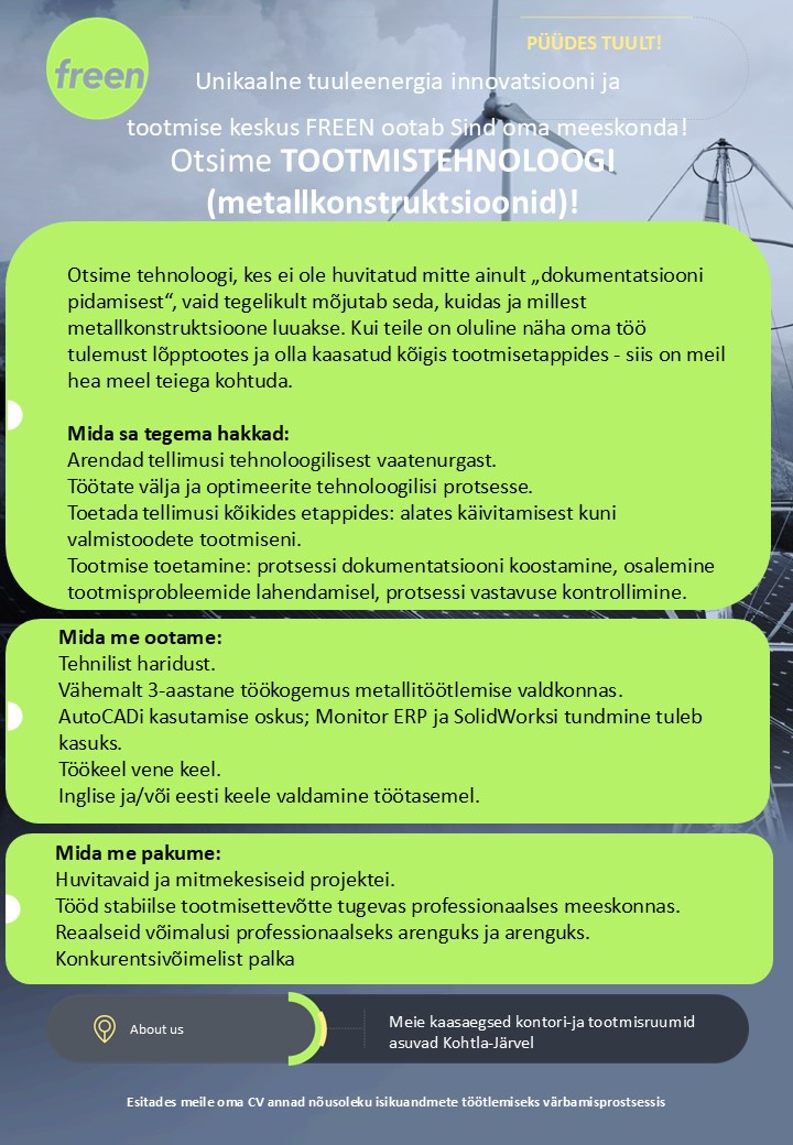 FREEN OÜ projekteerib, toodab ja hooldab väiketuulikuid WTW-55. Ühendades need päikesepaneelide ja suurte tuuleturbiinidega, töötame välja hajutatud elektrisüsteeme ettevõtetele. Selle tulemusena loovad meie kliendid tõhusa äri taastuvenergia turul individuaalsetele vajadustele. Rohkem infot leiad aadressilt https://freen.com/