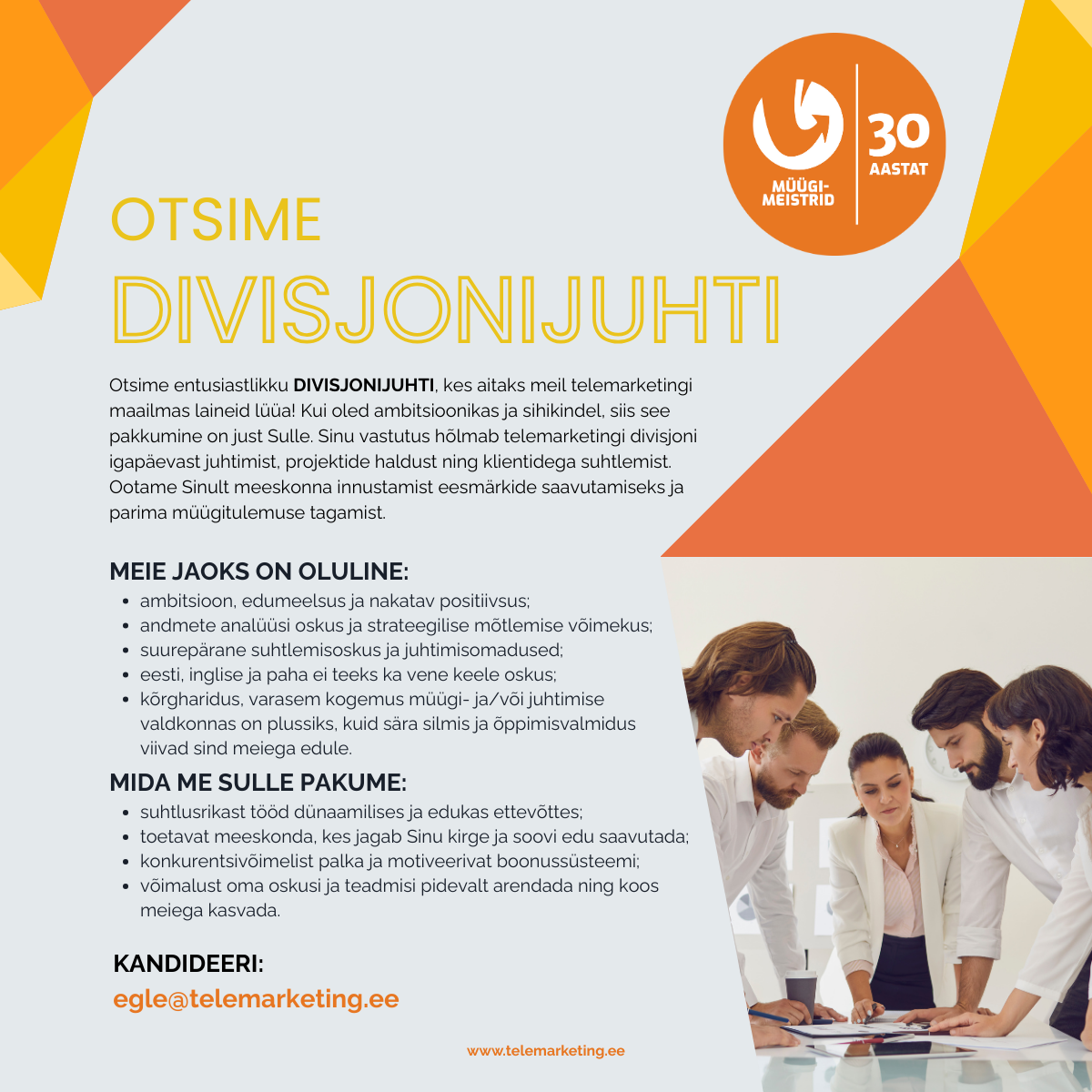 Müügimeistrite AS on telefoniturunduse tuntuim tegija juba aastast 1996, kes pakub tööd enamikes Eesti suurimates linnades, asudes reeglina hästi ligipääsetavates kohtades linnade keskpunktides. Töö tegemise võimalust pakume ka kaugtöövormis. Eesti ettevõttes töötab pea 200 töötajat ja samapalju meie tütarettevõttes Läti Vabariigis. Telefoniturundust ehk telemarketingi kasutavad paljude erinevate valdkondade tipptegijad nii teenuste ja toodete müümisel kui ka küsitluste ja uuringute läbiviimisel.