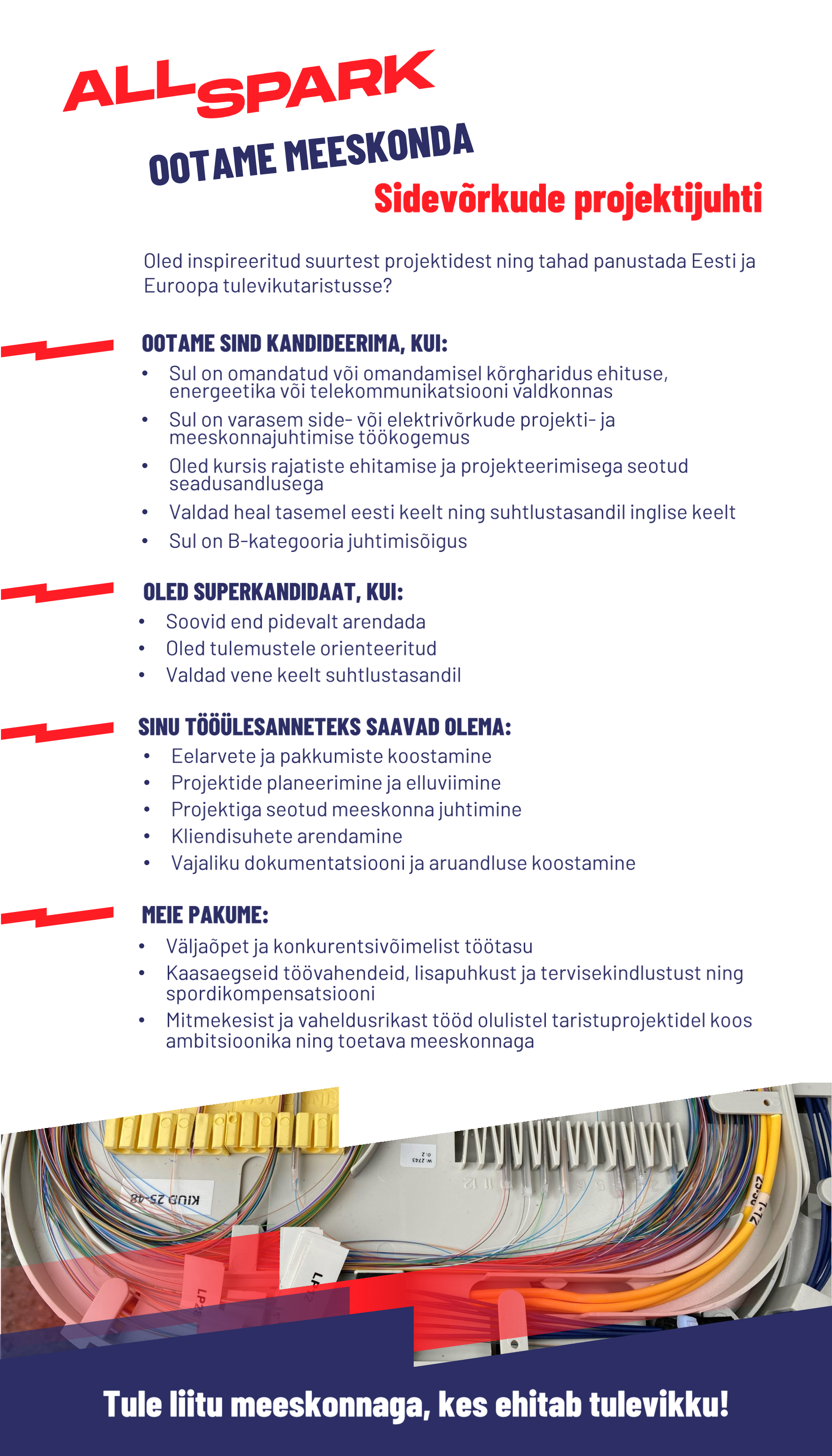 AllSpark tegeleb taristu tehnoloogia terviklahenduste pakkumisega - peamiselt oleme spetsialiseerunud telekommunikatsiooni, raudtee liiklusjuhtimissüsteemide, automaatika, kontaktvõrgu ja elektrilahenduste projekteerimisele, ehitusele-integratsioonile, tugi- ja konsultatsiooniteenuste osutamisele. Pakume võimalust osaleda sajandi suurprojektis ning anda oma panus Rail Baltica valmimisse, samuti Eesti elektri-ja sidevõrkude toimepidevuse ning varustuskindluse tõstmisesse!