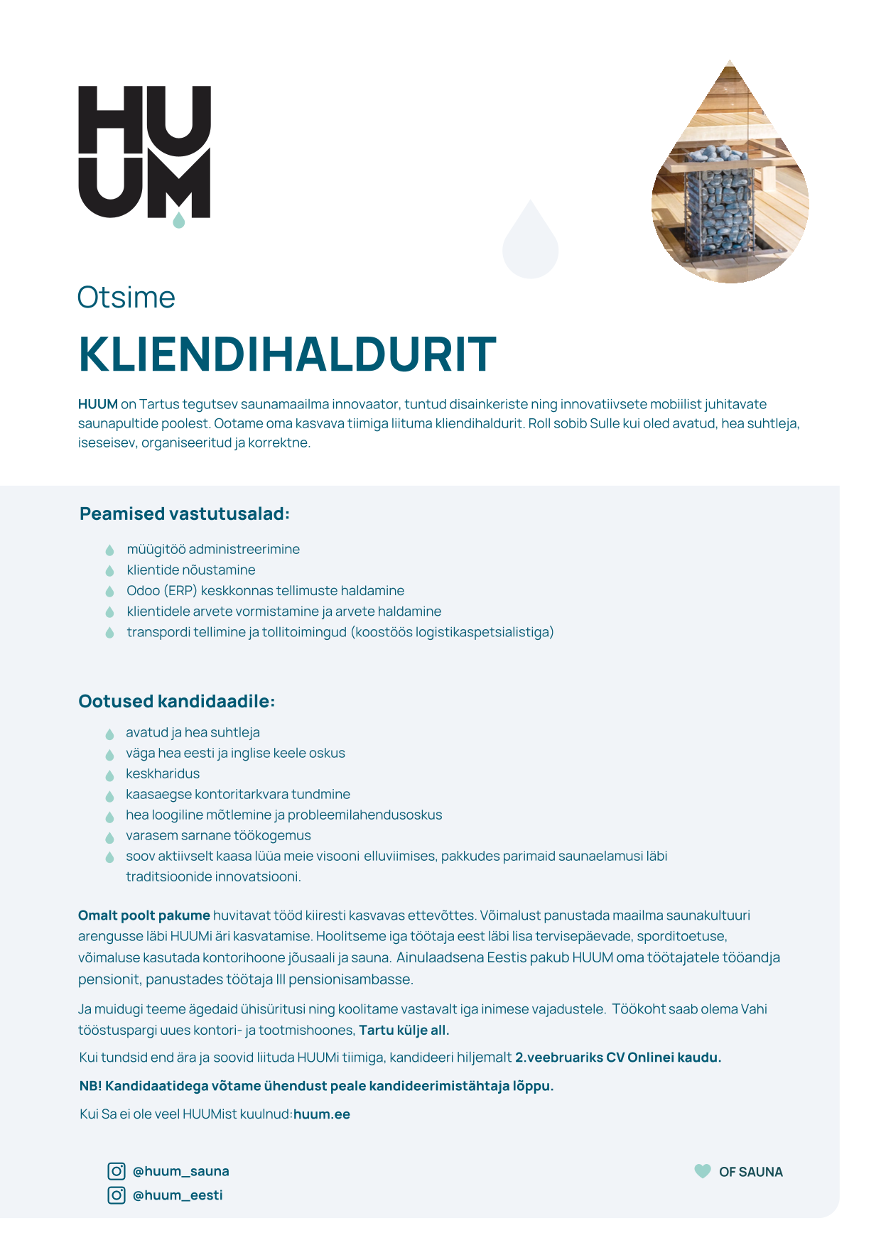 HUUM on sauna maailma innovaator, kes ühendab põlvkondade ülese kogemuse tänapäeva tehnoloogia viimase sõnaga. Meie tiim koosneb entusiastlikest saunafännidest, kes usuvad sauna loomuliku osasse tervise ja heaolu saavutamisel. Kõik me oleme üles kasvanud Eestis, kus on raske ette kujutada pika töönädala lõppu, külma talvepäeva või mõnusat suveõhtut maal ilma saunaskäiguta. Saun tähendab enda jaoks aja võtmist, keha ja vaimu taastamist, tervena püsimist ja lihtsalt head enesetunnet. Seepärast usume, et saun peab olema kättesaadav kõigile ja igal pool.
