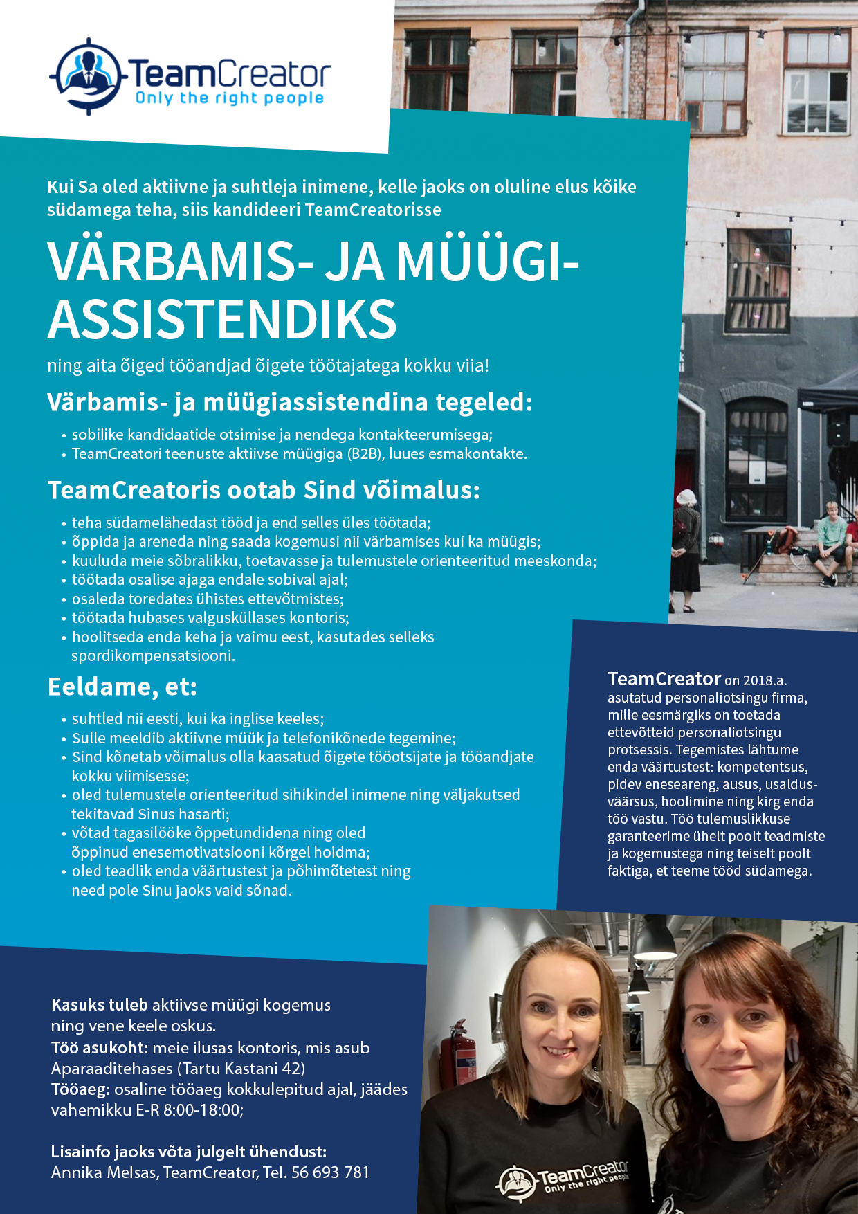 - TeamCreatori teenuste aktiivne müük (B2B), luues esmakontakte.