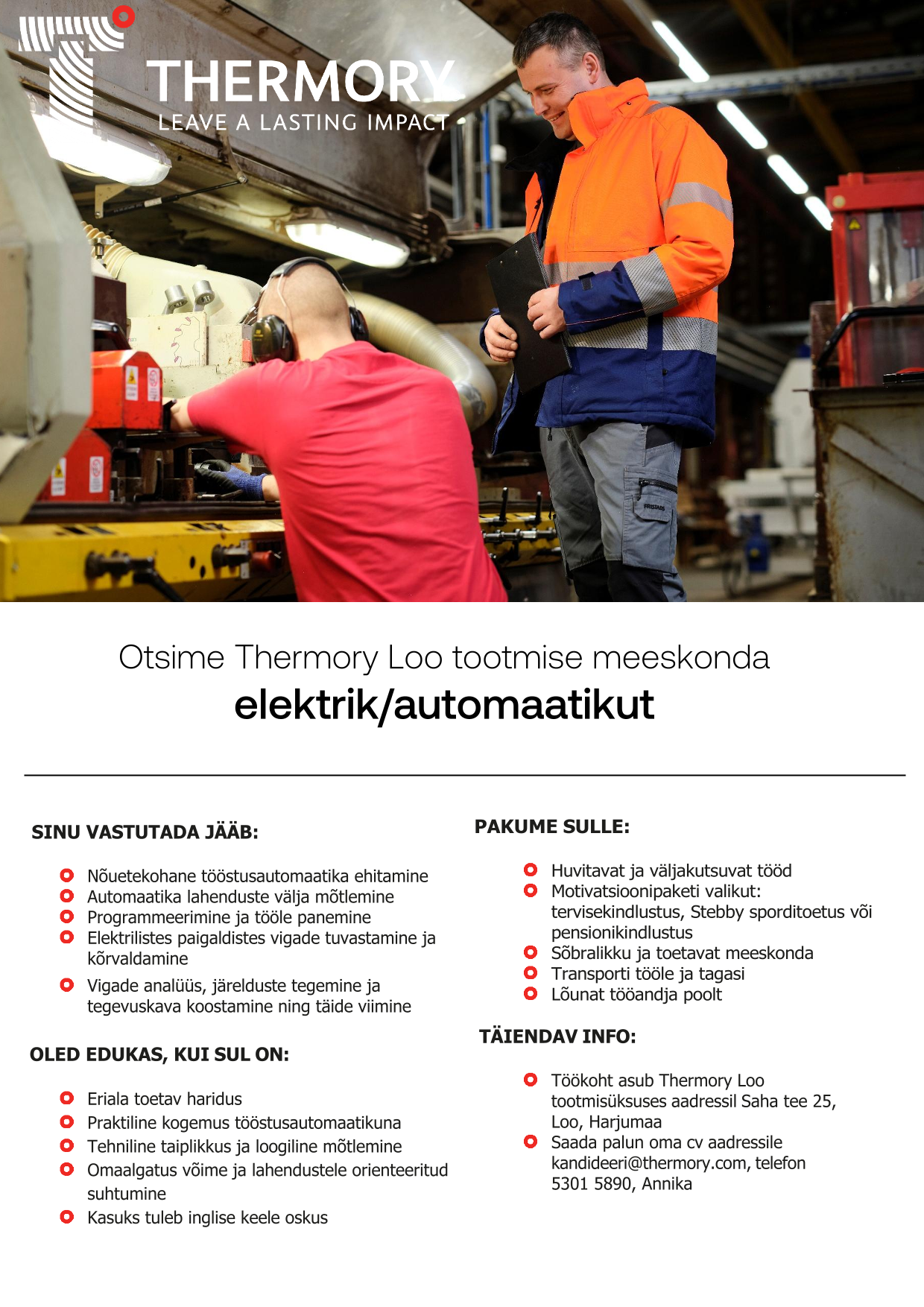 - Töökoht asub Thermory Loo tootmisüksuses aadressil Saha tee 25, Loo, Harjumaa