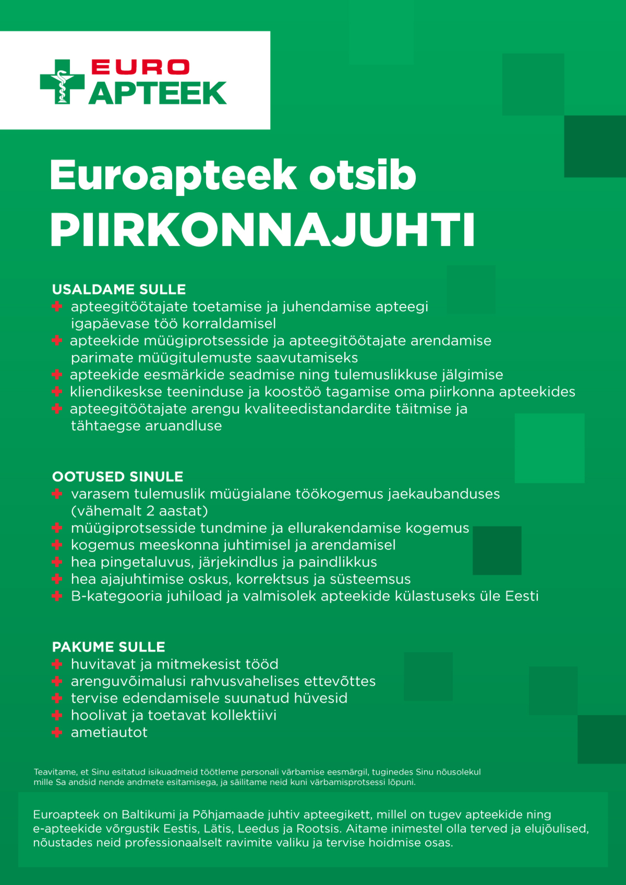 Euroapteek on edukas ja kiirelt arenev rahvusvahelisse kontserni kuuluv apteegikett, mis tegutseb Eestis juba 20 aastat. Euroapteegi frantsiisi all töötab 70 apteeki üle Eesti ning meie töötajatel on põhjalikud teadmised apteegiturust ja pikaajalised kogemused, mis aitavad hoolitseda inimeste tervise eest kvaliteetselt ja parima hinnaga.