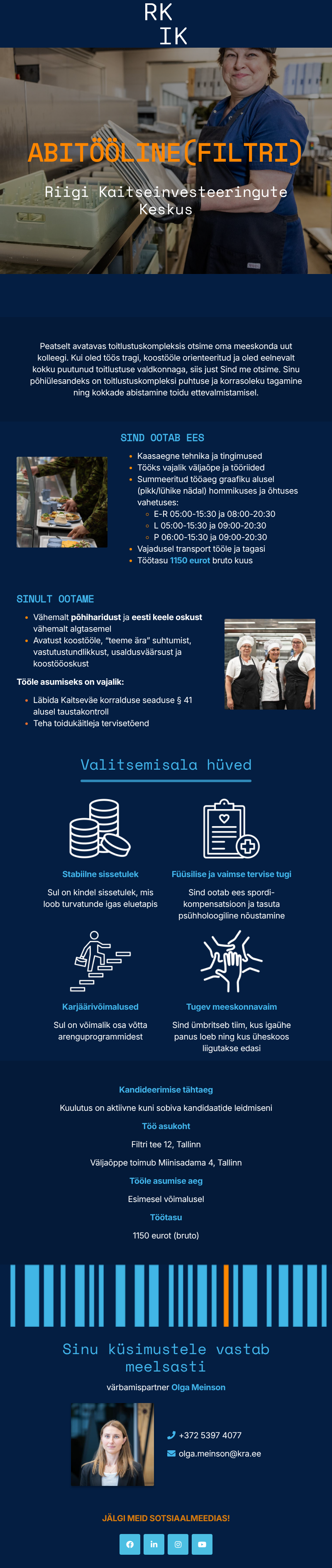 RKIK – Riigi Kaitseinvesteeringute Keskus – on kaitseministeeriumi valitsemisala keskne hankija, kes vastutab materjalide ja teenuste kättesaadavuse eest ning tagab riigikaitseks vajaliku toimiva ja ohutu taristu. Meie eesmärk on võimaldada riigikaitsetega tegelevatel organisatsioonidel keskenduda oma põhitegevustele, vähendades nende halduskoormust ja tagades Eesti kaitsevõime maksimaalselt efektiivse arengu. Meie kollektiivi kuuluvad oma valdkondade tipptasemel insenerid, spetsialistid ja juhid, kokad ja abikokad, kes tagavad enda oskuste ja teadmistega kaitsevaldkonna kiire ning efektiivse varustatuse ja arengu.