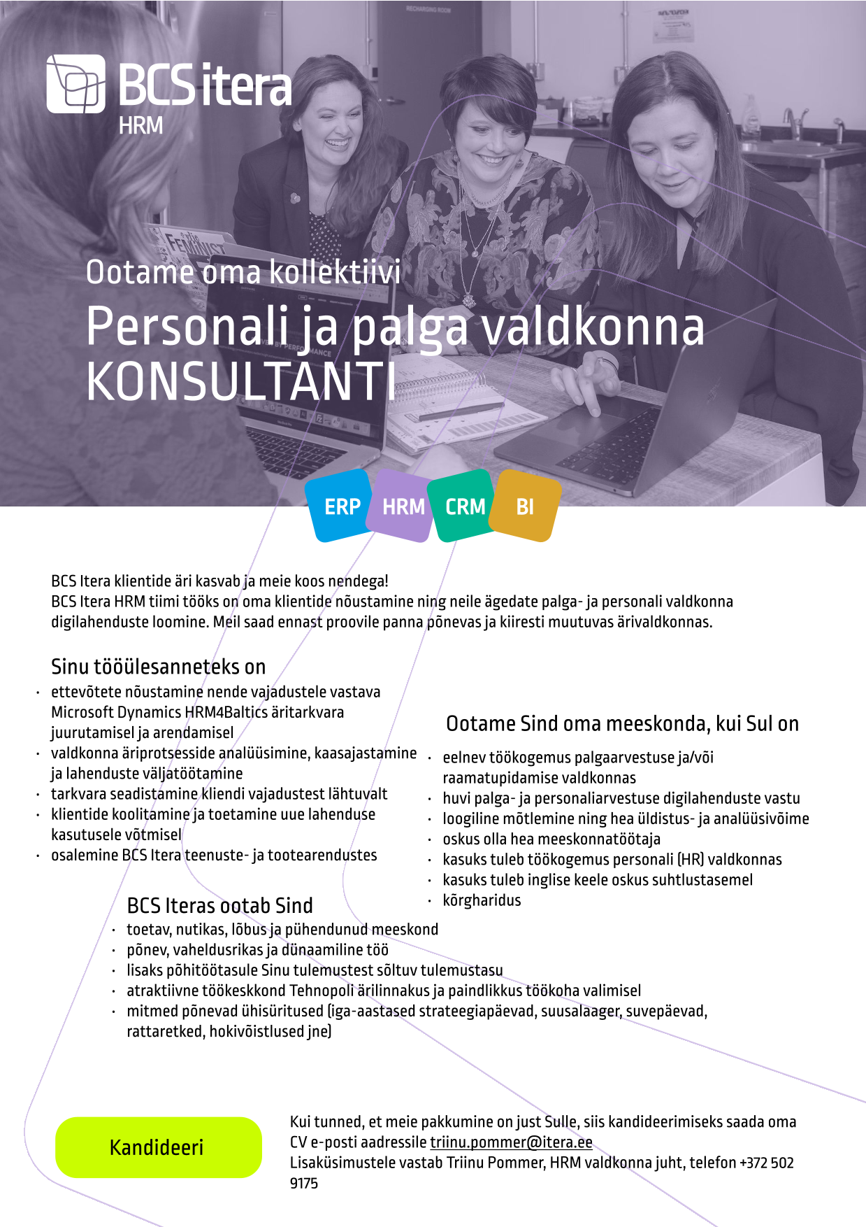 BCS Itera meeskonda kuulub üle 100 majandustarkvara ja ärianalüüsi lahenduste fänni, kelle jaoks meie äri valdkond ja klientidele parimate võimaluste pakkumine on kireks.Meie missiooniks on nõustada ja viia ellu konkurentsieeliseid loovaid majandustarkvara (ERP) ja sellega kaasnevaid lahendusi nagu ärianalüüs (BI), palga- ja personali (HRM) ja kliendihaldus (CRM).Tänaseks oleme tänulikud eduka koostöö eest ca 750´le ettevõttele ja paljudele partneritele.BCS Itera põhiväärtusteks on elluviimine, meeskonnatöö, professionaalsus ja pühendumine.Rohkem BCS Itera ettevõtte kultuuri ja selle kohta, millised me oleme tööandjana, saab lugeda siit:https://www.itera.ee/2024/04/bcs-itera-it-firma-mis-nagu-polegi-it-firma/