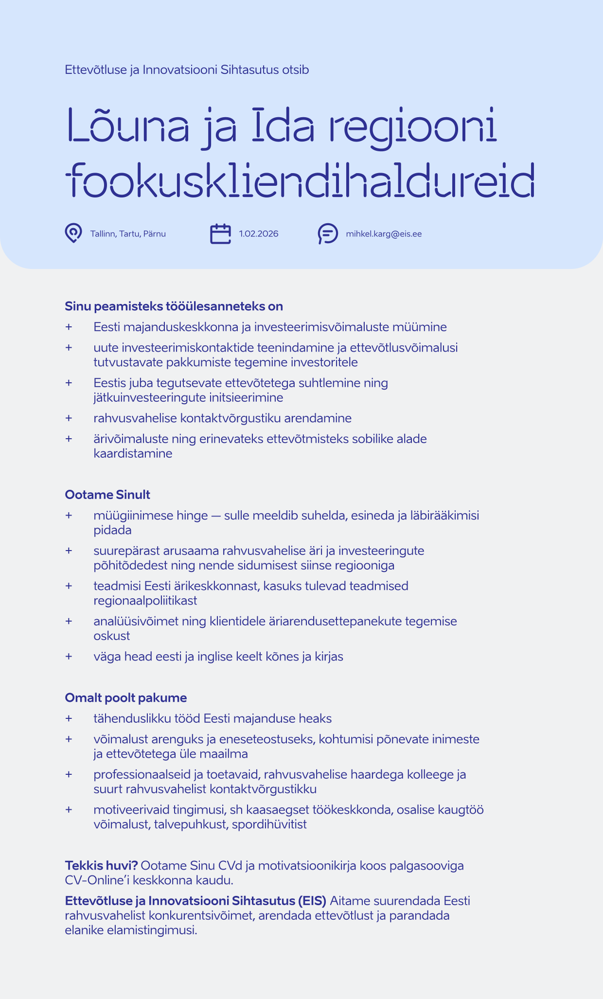 Ettevõtluse ja Innovatsiooni Sihtasutus (EIS) on riigi poolt asututatud sihtasutus, mille eesmärk on suurendada Eesti rahvusvahelist konkurentsivõimet, arendada ettevõtlust ja elukeskkonda. Aitame ettevõtetel kasvada, laieneda välisturgudele ning toetame tehnoloogiavaldkonna arengut. Meie eesmärk on muuta Eesti atraktiivseks paigaks nii ettevõtetele, tippspetsialistidele kui ka väliskülalistele. Eraisikuid toetame elamistingimuste parandamisel.