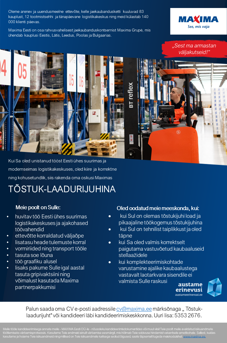 Maxima Eesti OÜ on juhtiv jaekaubandusettevõte, mis pakub tööd enam kui 3800 inimesele üle Eesti.