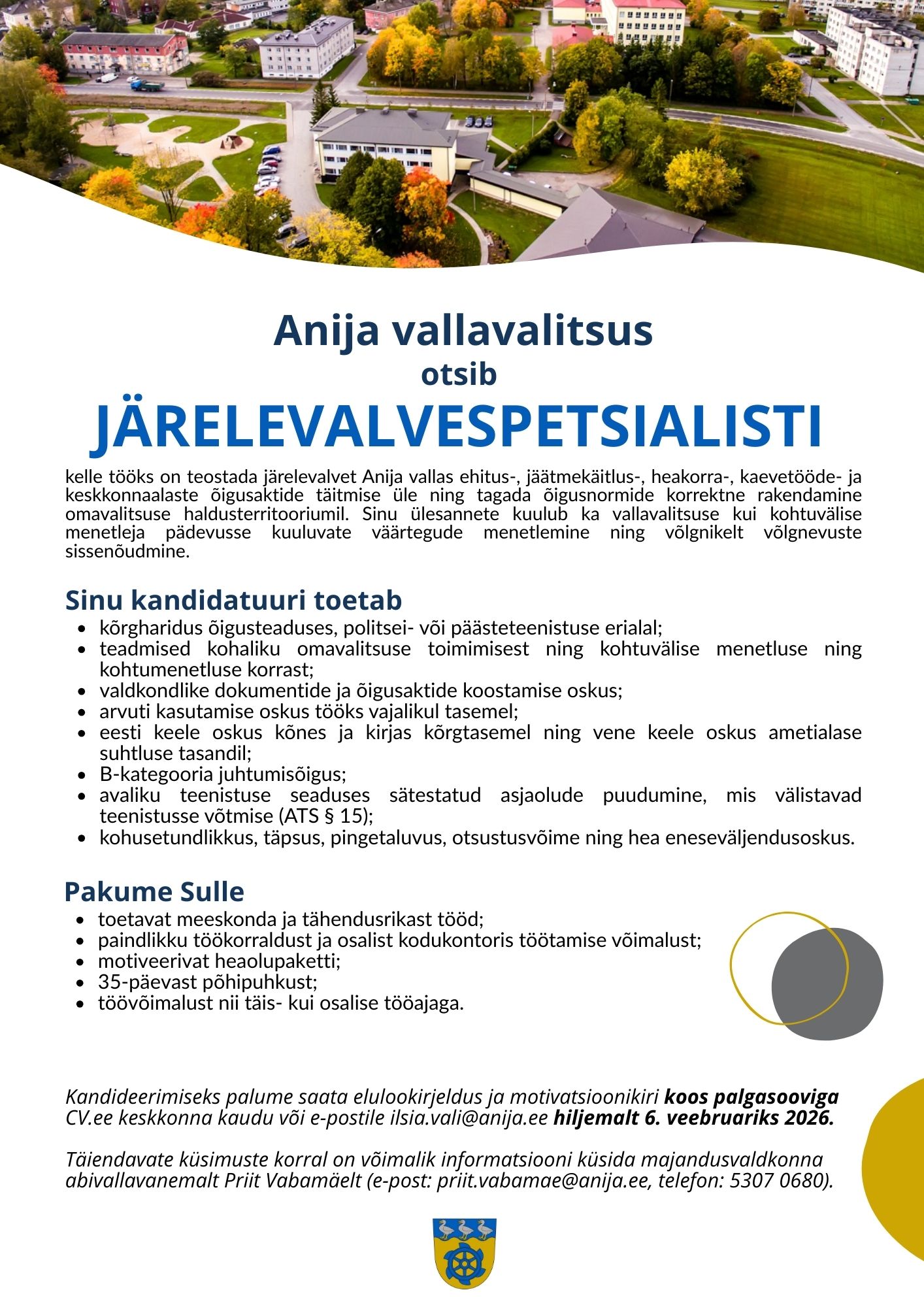 Anija vallas Harjumaal elab ligi 6400 inimest, oleme elamisväärse elukeskkonnaga, majanduslikult mitmekesine, elujõulise kogukonnaga arenev omavalitsus. Anija valla keskuseks on Kehra linn, kus on mugav ja kiire rongiühendus Tallinnaga.