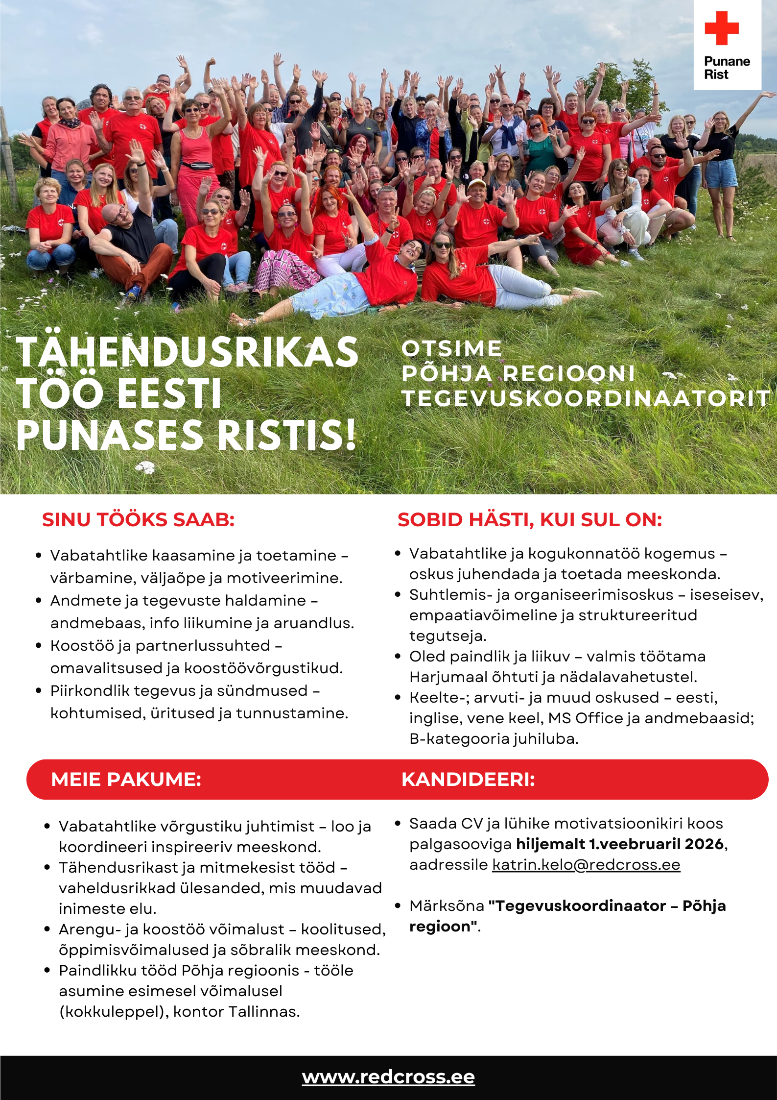 Usud, et väikestel tegudel on suur mõju? Kas oskad inimesi innustada ja luua ühtset meeskonda ühise eesmärgi nimel? Kui soovid panustada kogukonda ja aidata inimesi, kui abi on kõige enam vaja, siis see töö on Sulle!