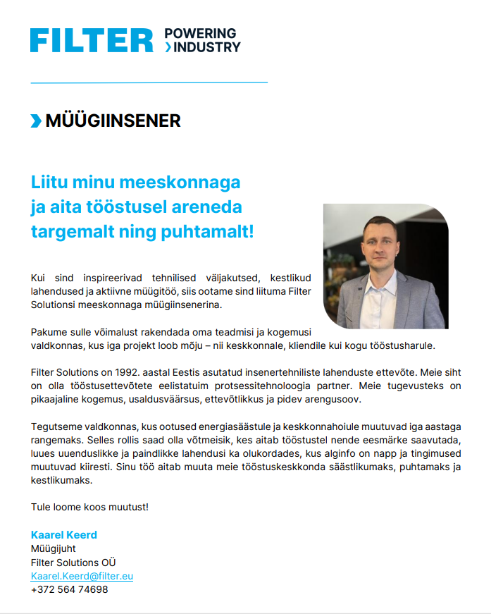 - Karjäärivõimalused Filtris väärtustame inimeste arengut ning pakume võimalusi oma oskuste ja teadmiste pidevaks täiendamiseks. Meie meeskonnas saad kasvada koos ettevõttega liikuda edasi, võtta vastu uusi väljakutseid ja kujundada oma professionaalset teekonda mitmekesises ja arenevas keskkonnas.