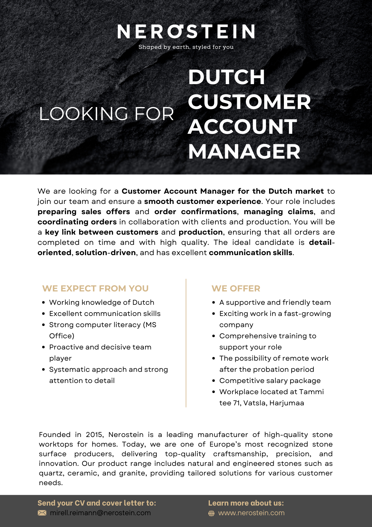 Founded in 2015, Nerostein is a leading manufacturer of high-quality stone worktops for homes. Today, we are one of Europe’s most recognized stone surface producers, delivering top-quality craftsmanship, precision, and innovation. Our product range includes natural and engineered stones such as quartz, ceramic, and granite, providing tailored solutions for various customer needs.