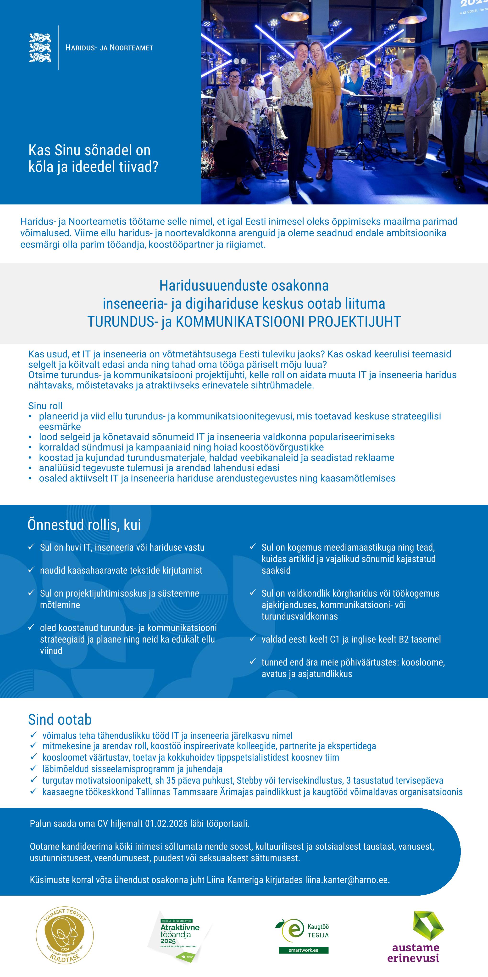 Haridus- ja Noorteametis töötame selle nimel, et igal Eesti inimesel oleks õppimiseks maailma parimad võimalused. Viime ellu haridus- ja noortevaldkonna arenguid ja oleme seadnud endale ambitsioonika eesmärgi olla parim tööandja, koostööpartner ja riigiamet.