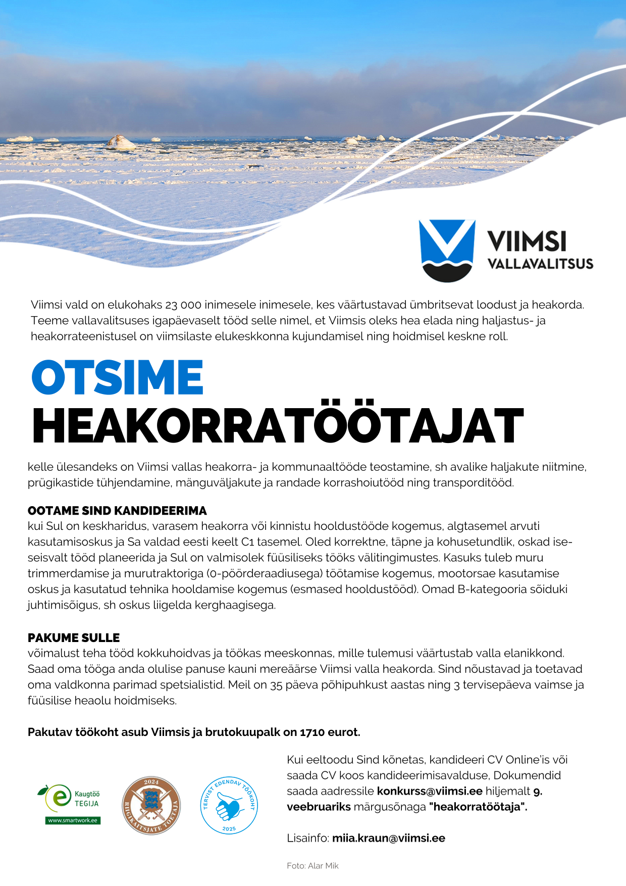 Viimsi vald on koduks üle 23 000 inimesele. Siinne kogukond väga hoolib oma mereäärsest elukeskkonnast ja elab kaasa Viimsis toimuvale. Vallavalitsuse töötajad pingutavad iga päev selle nimel, et piirkonna ja meie väikesaarte areng oleks tagatud moel, mis vastaks viimsilaste ja külaliste ootustele ja vajadustele. Teeme julgeid ja suuri asju eesmärgiga, et Viimsis oleks hea kasvada, elada, liikuda, nautida kultuuri ja loodust. Vallavalitsus koos allasutustega on tööandjaks ligikaudu 700 töötajale, kes annavad endast parima, et vajalikud teenused oleks tagatud ja inimesed tunneksid end Viimsis hoituna. Viimsilaste nimel tegutsedes ei unusta me ka enda töörõõmu - oleme tunnustatud tervisliku töökohana ja meile on omistatud tervist edendava töökoha märgis, oleme liitunud mitmekesisuse kokkuleppega. Väärtustame paindlikku töökorraldust ja omame kaugtöö tegija märgist.