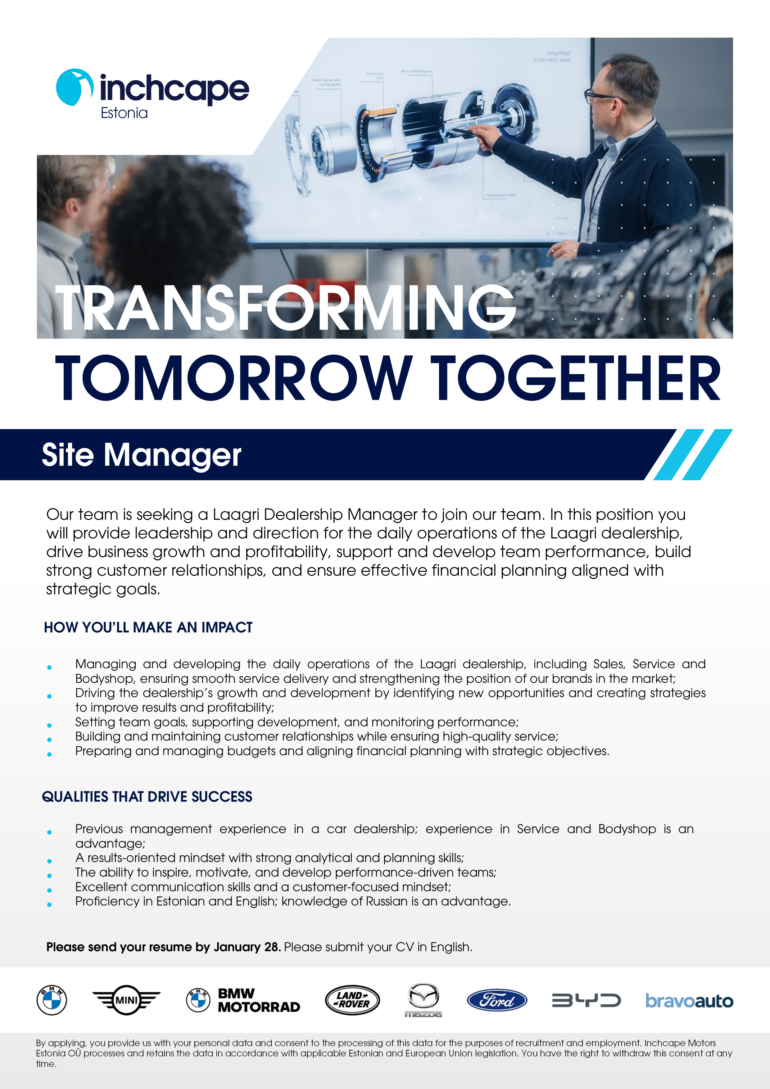 - Managing and developing the daily operations of the Laagri dealership, including Sales, Service and Bodyshop, ensuring smooth service delivery and strengthening the position of our brands in the market;