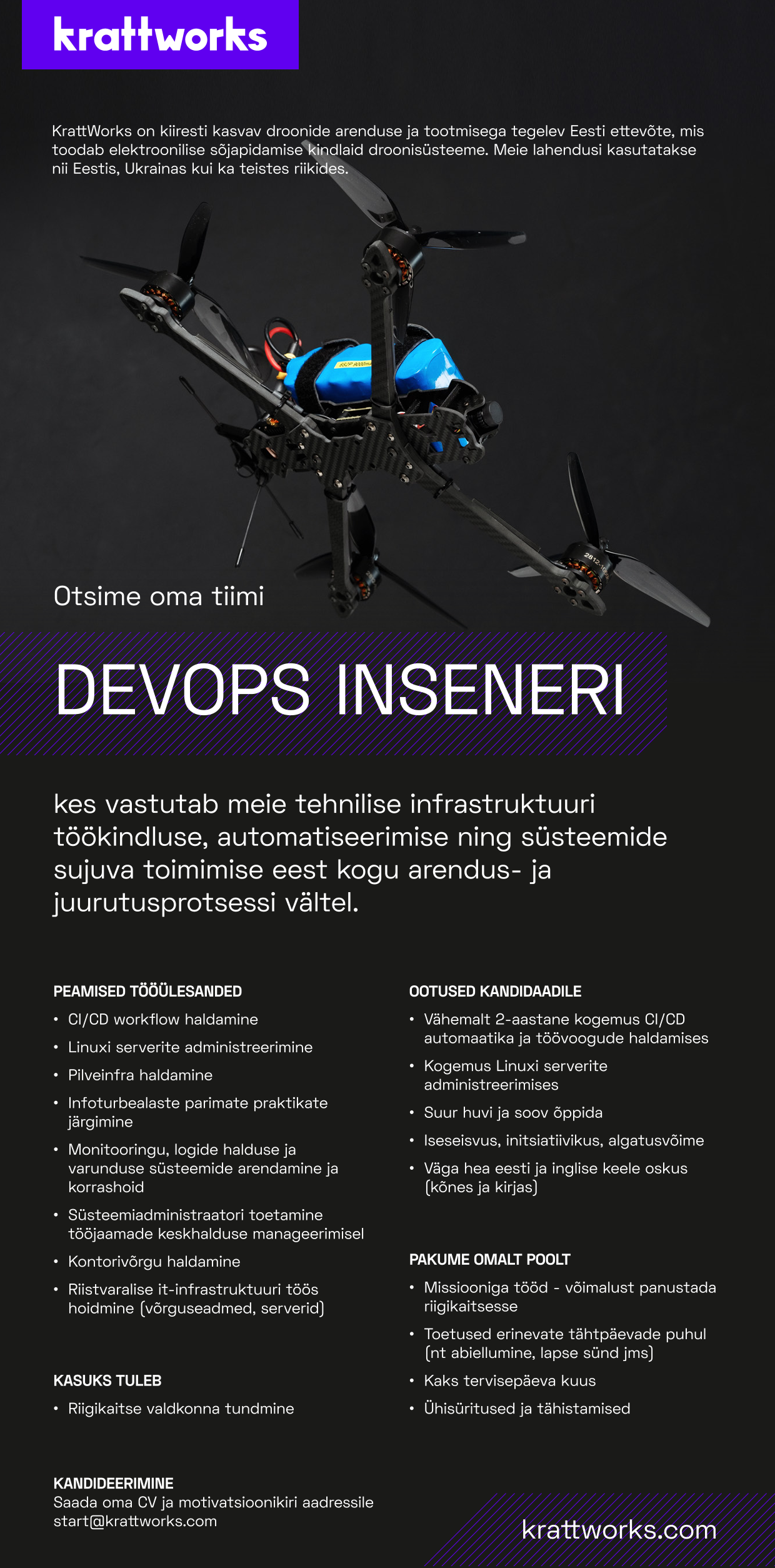 KrattWorks is a fast-growing Estonian defence company specializing in the development and manufacturing of electronic warfare resistant drones. Our solutions are used in Estonia, Ukraine, and other countries.