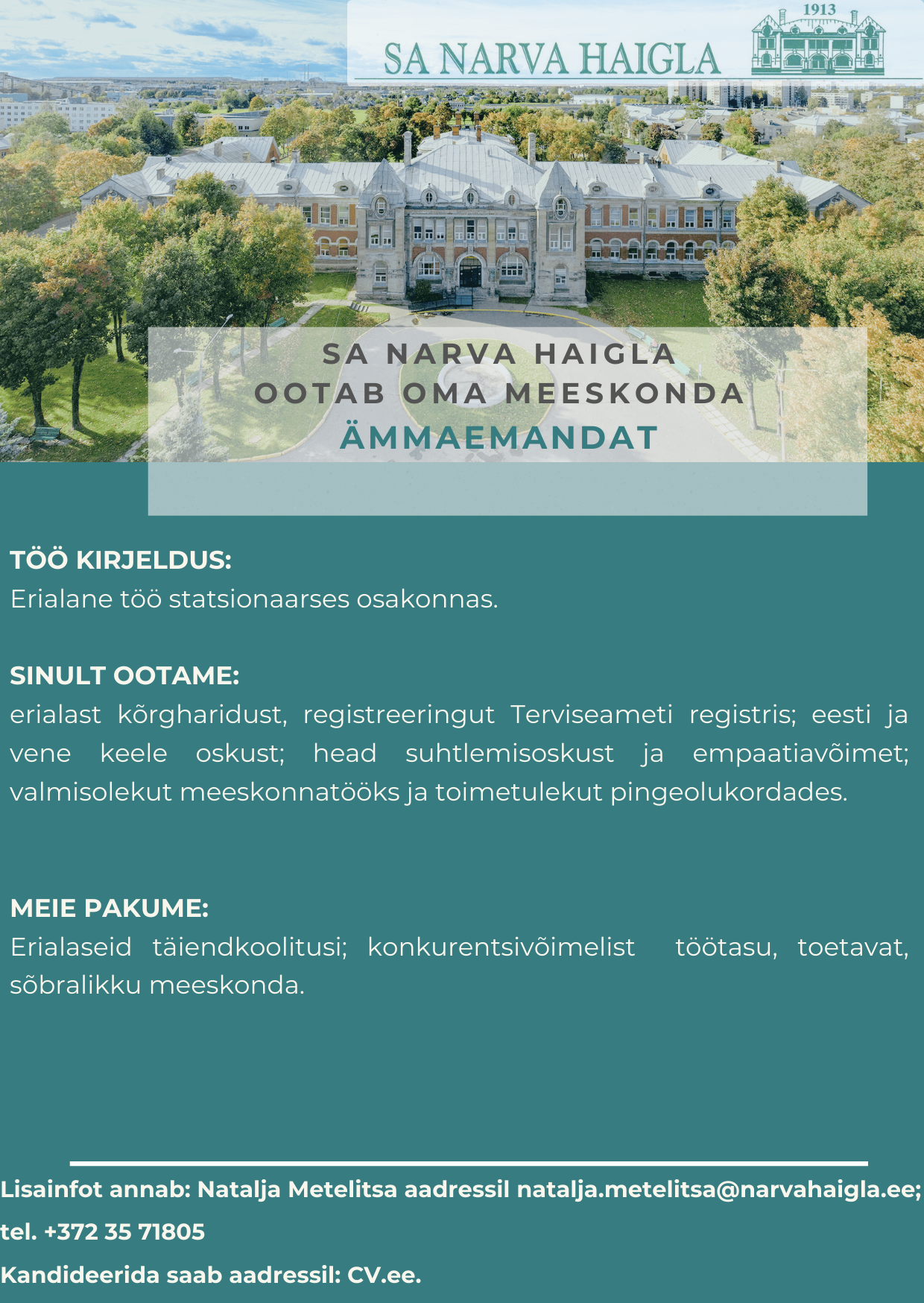 erialast kõrgharidust, registreeringut Terviseameti registris; eesti ja vene keele oskust; head suhtlemisoskust ja empaatiavõimet; valmisolekut meeskonnatööks ja toimetulekut pingeolukordades.