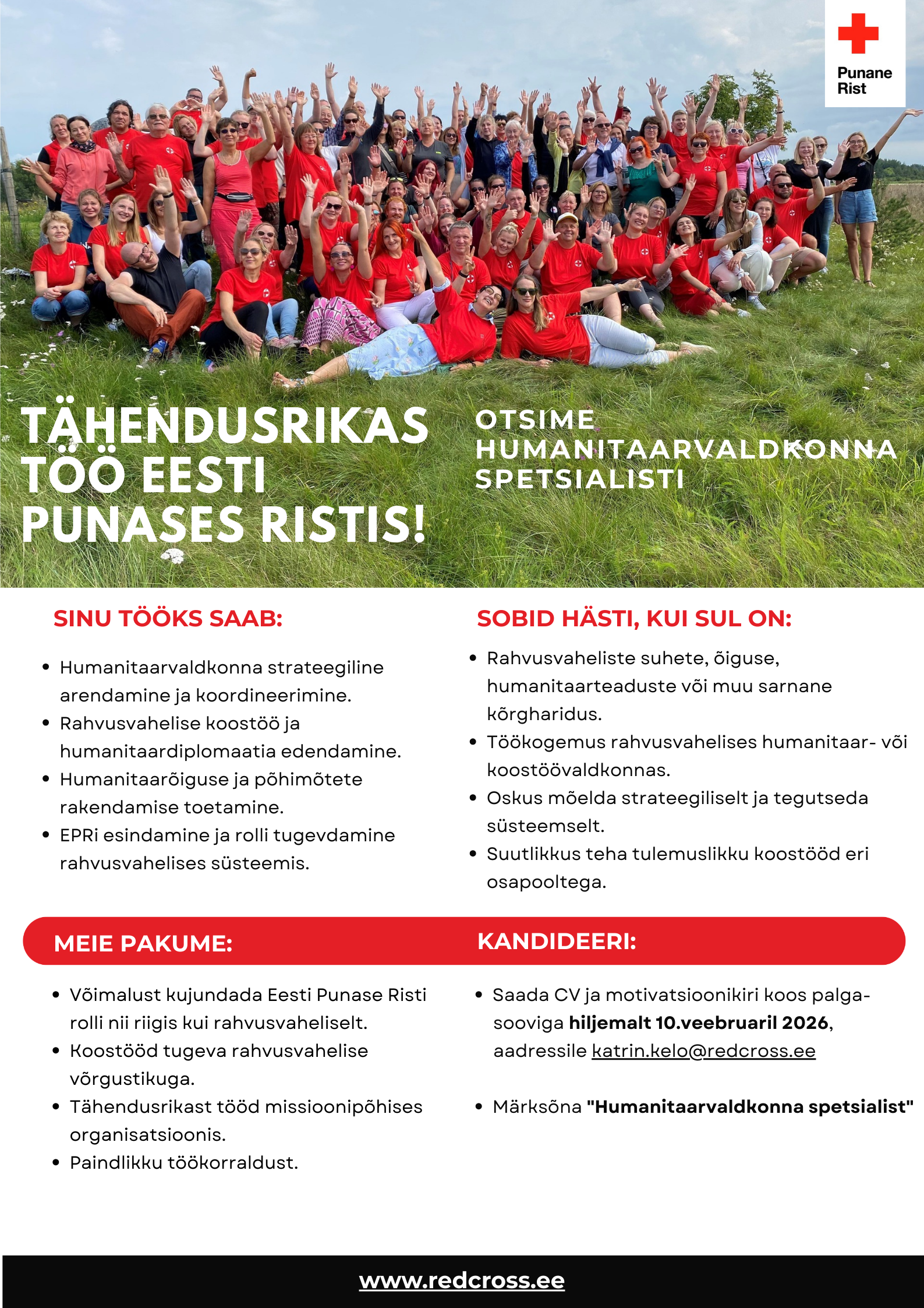 Kas Sind köidab võimalus kujundada Eesti Punase Risti rolli rahvusvahelises humanitaarvaldkonnas ning tuua oma teadmised ja kogemused strateegilise koostöö, humanitaarõiguse ja rahvusvaheliste projektide elluviimise teenistusse? Kui soovid panustada, et abi jõuaks õigel ajal õigesse kohta, toetada koostööd partneritega üle kogu maailma ning arendada humanitaarsete tegevuste raamistikku Eestis ja rahvusvaheliselt, siis ootame Sind meie meeskonda, et koos tugevdada solidaarsust, valmisolekut ja usaldust kriisiolukordades ning rahuajal.