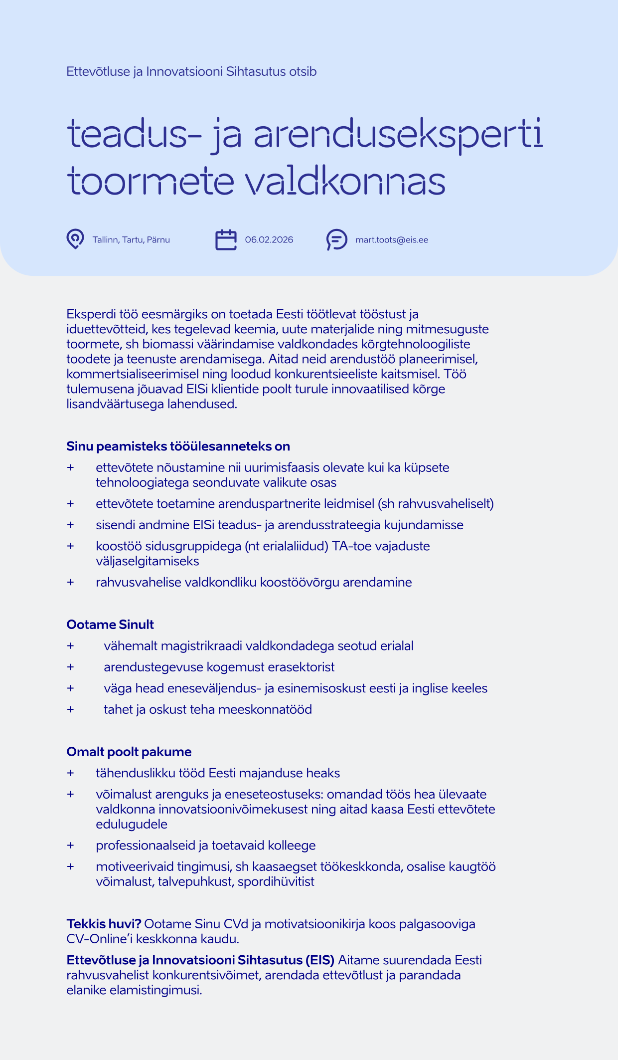 Ettevõtluse ja Innovatsiooni Sihtasutus (EIS) on riigi poolt asututatud sihtasutus, mille eesmärk on suurendada Eesti rahvusvahelist konkurentsivõimet, arendada ettevõtlust ja elukeskkonda. Aitame ettevõtetel kasvada, laieneda välisturgudele ning toetame tehnoloogiavaldkonna arengut. Meie eesmärk on muuta Eesti atraktiivseks paigaks nii ettevõtetele, tippspetsialistidele kui ka väliskülalistele. Eraisikuid toetame elamistingimuste parandamisel.