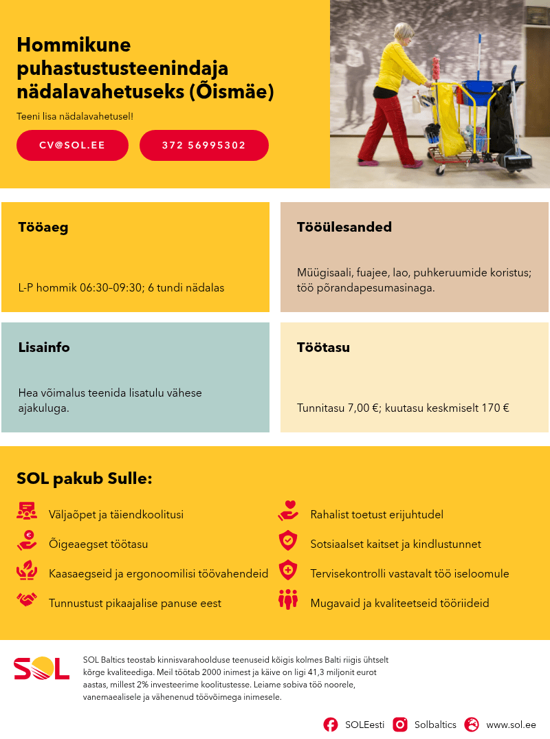 Lisahüved: Töö graafiku alusel. Koolitused. Sõbralik kollektiiv. Kindel sissetulek nädalavahetuseti.
