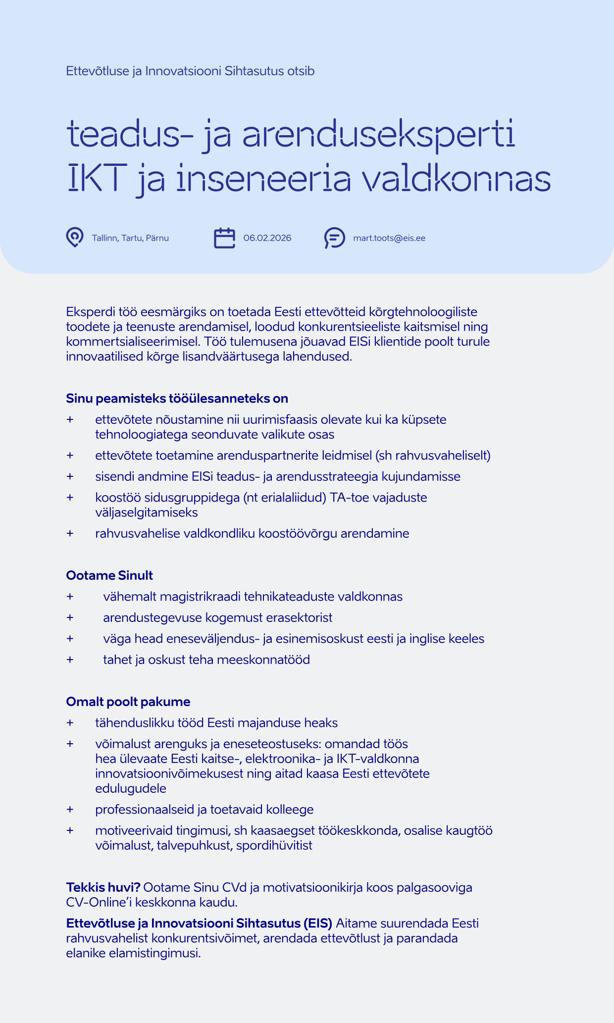 Ettevõtluse ja Innovatsiooni Sihtasutus (EIS) on riigi poolt asututatud sihtasutus, mille eesmärk on suurendada Eesti rahvusvahelist konkurentsivõimet, arendada ettevõtlust ja elukeskkonda. Aitame ettevõtetel kasvada, laieneda välisturgudele ning toetame tehnoloogiavaldkonna arengut. Meie eesmärk on muuta Eesti atraktiivseks paigaks nii ettevõtetele, tippspetsialistidele kui ka väliskülalistele. Eraisikuid toetame elamistingimuste parandamisel.
