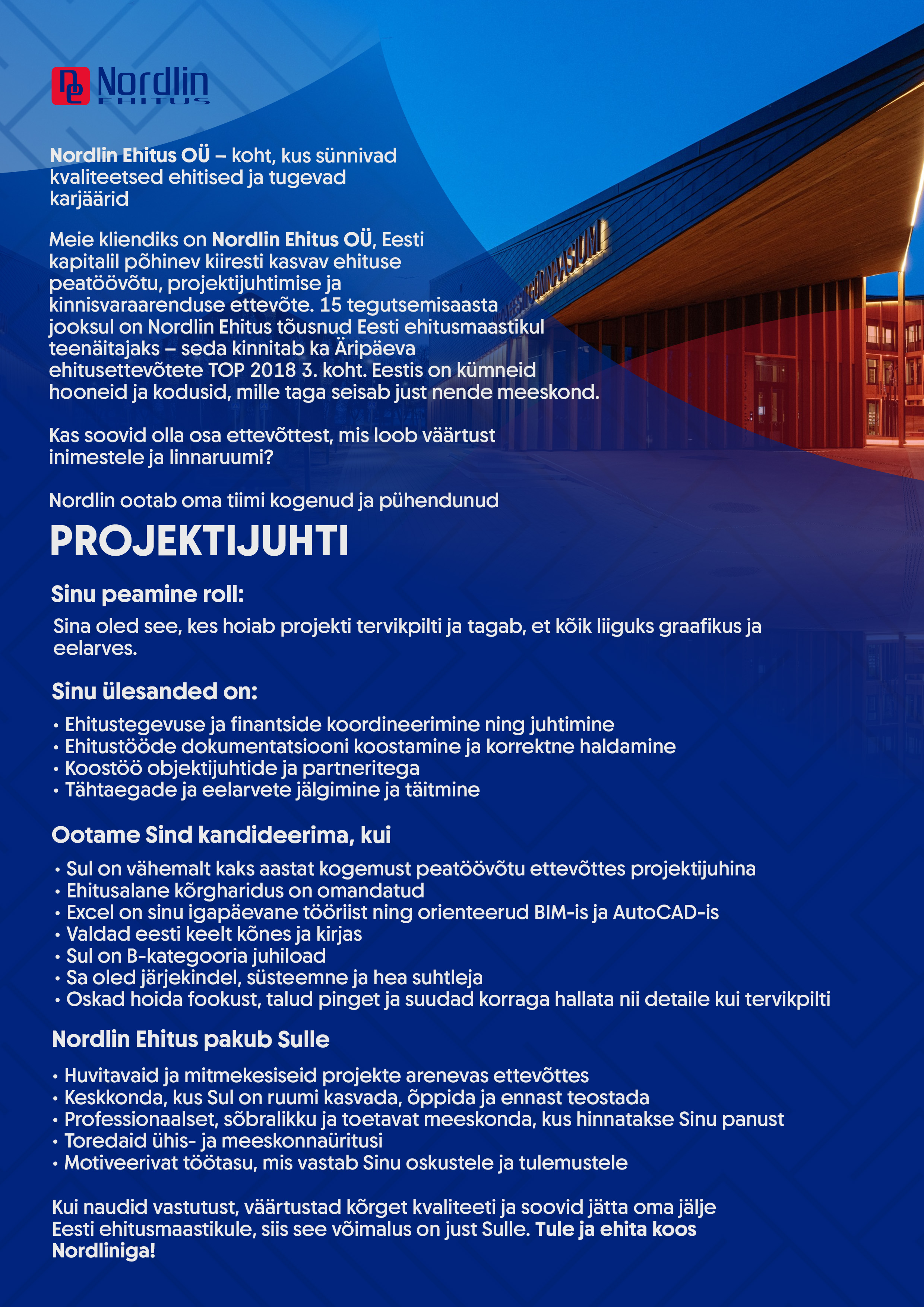 Nordlin ootab oma tiimi kogenud ja pühendunud PROJEKTIJUHTI või OBJEKTIJUHTI kes soovib areneda projektijuhiks.