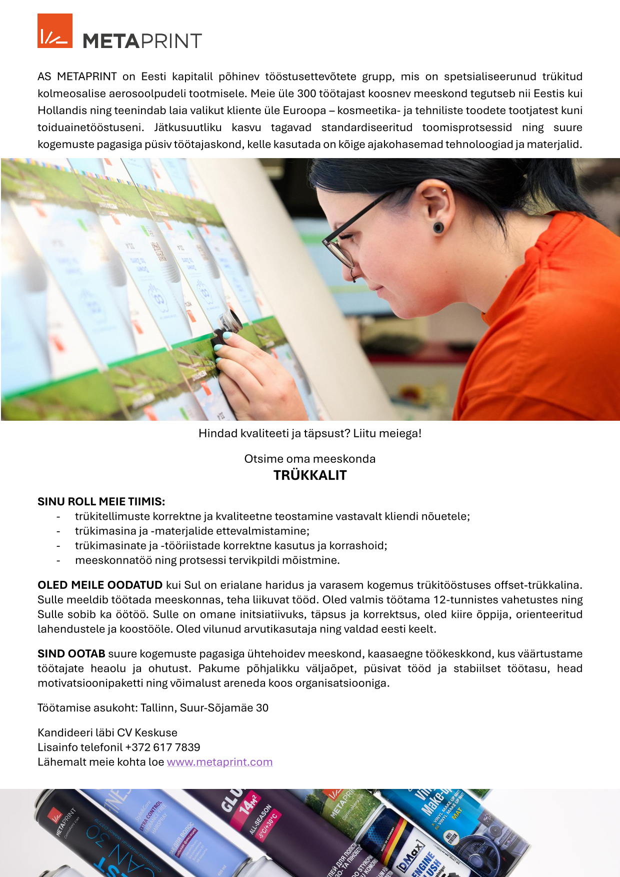 AS METAPRINT on Eesti kapitalil põhinev tööstusettevõtete grupp, mis on spetsialiseerunud trükitud kolmeosalise aerosoolpudeli tootmisele. Meie üle 300 töötajast koosnev meeskond tegutseb nii Eestis kui Hollandis ning teenindab laia valikut kliente üle Euroopa – kosmeetika- ja tehniliste toodete tootjatest kuni toiduainetööstuseni. Jätkusuutliku kasvu tagavad standardiseeritud toomisprotsessid ning suure kogemuste pagasiga püsiv töötajaskond, kelle kasutada on kõige ajakohasemad tehnoloogiad ja materjalid.