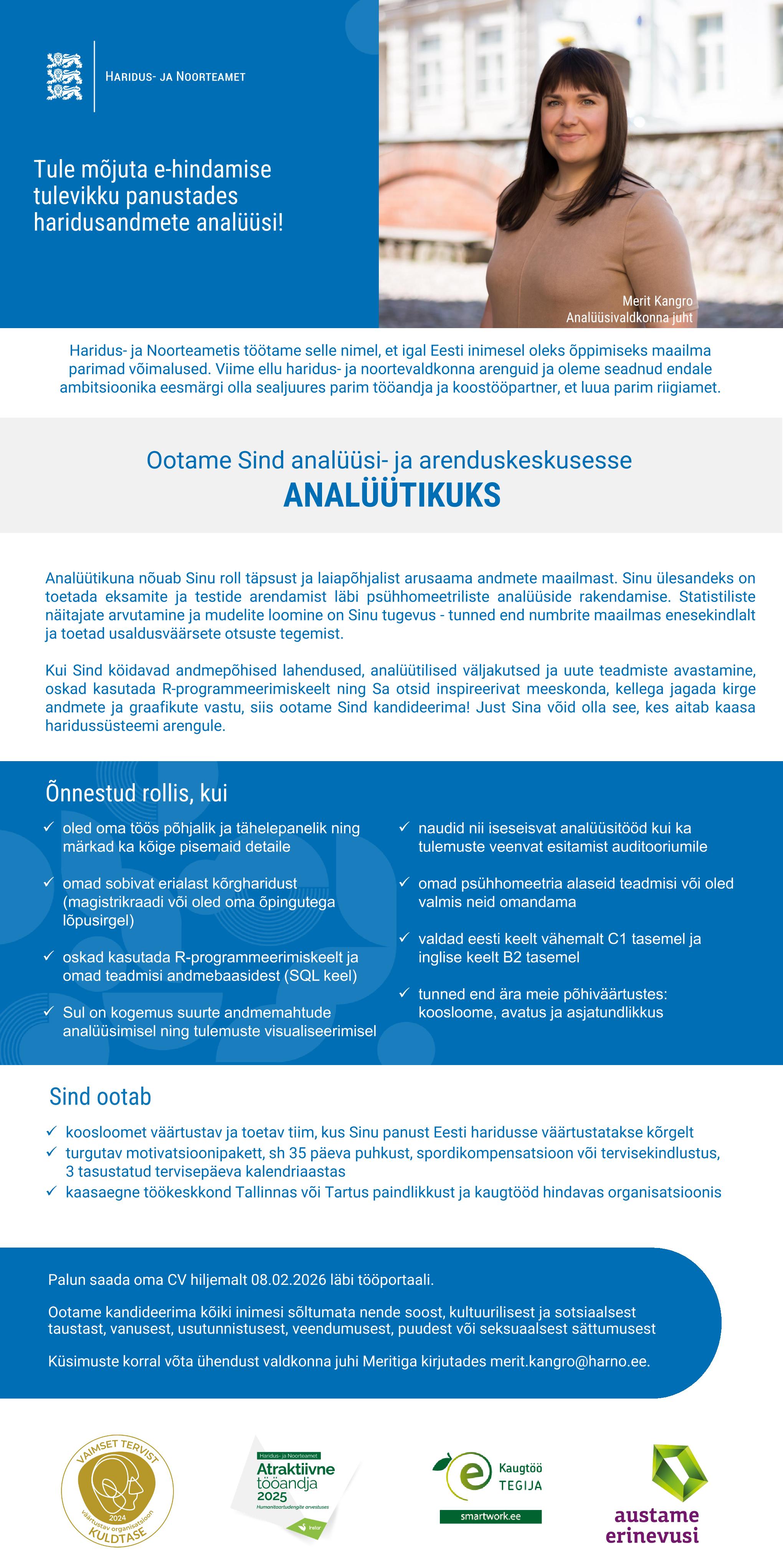 Haridus- ja Noorteametis töötame selle nimel, et igal Eesti inimesel oleks õppimiseks maailma parimad võimalused. Viime ellu haridus- ja noortevaldkonna arenguid ja oleme seadnud endale ambitsioonika eesmärgi olla parim tööandja, koostööpartner ja riigiamet.