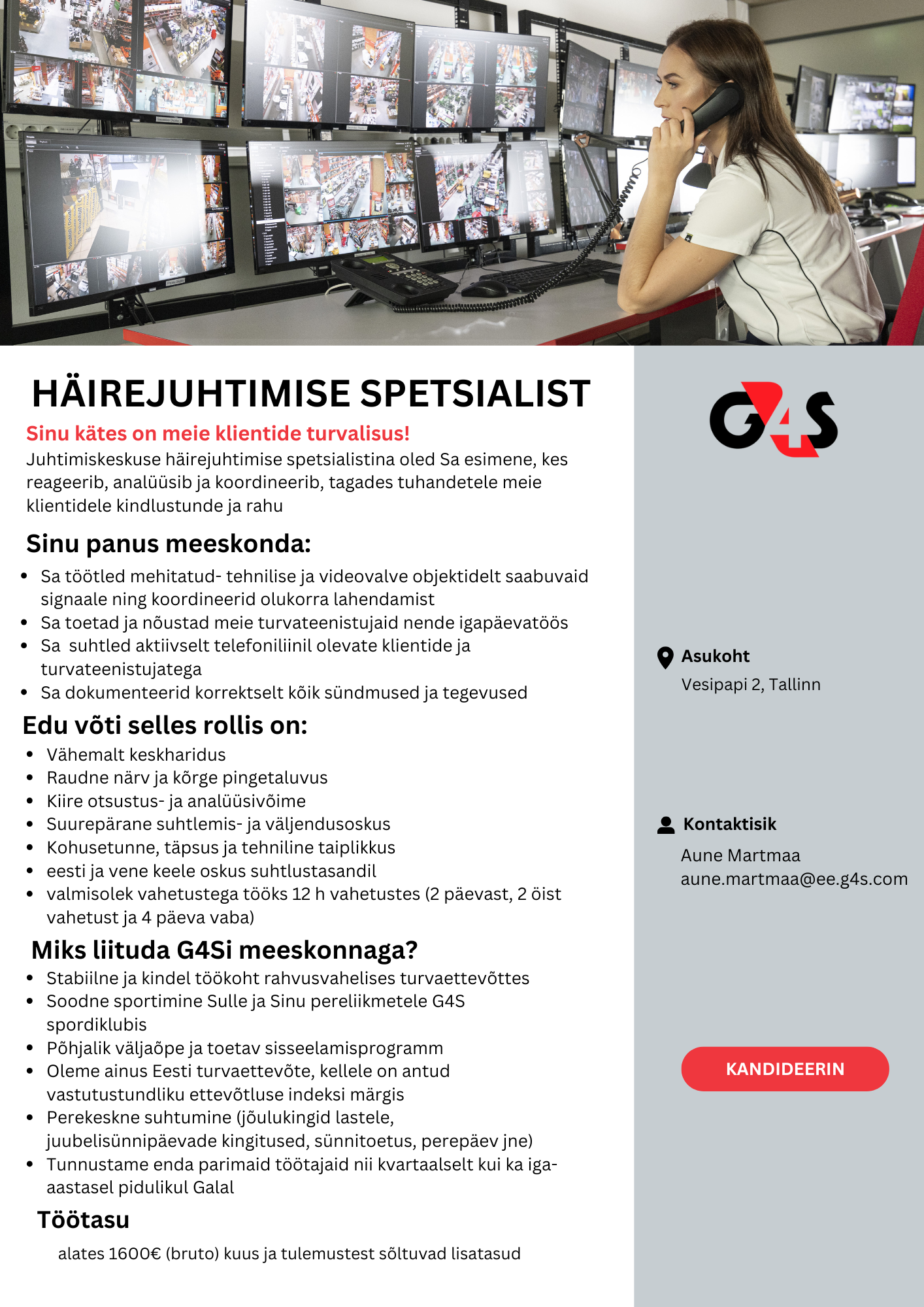 G4S on juhtiv turvateenuseid pakkuv rahvusvaheline kontsern, mis tegutseb rohkem kui 85 riigis üle maailma. Eestis anname tööd ligi 1900 inimesele. Meie eesmärk on olla hinnatuim turvalahenduste pakkuja. Oleme pühendunud kohaliku kogukonna toetamisele ja aitamisele läbi erinevate tegevuste: muudame koostöös kohalike omavalitsustega elukeskkonna turvalisemaks, anname oma panuse spordi arengusse ja harime kogukonda üldturvalisuse valdkonnas.