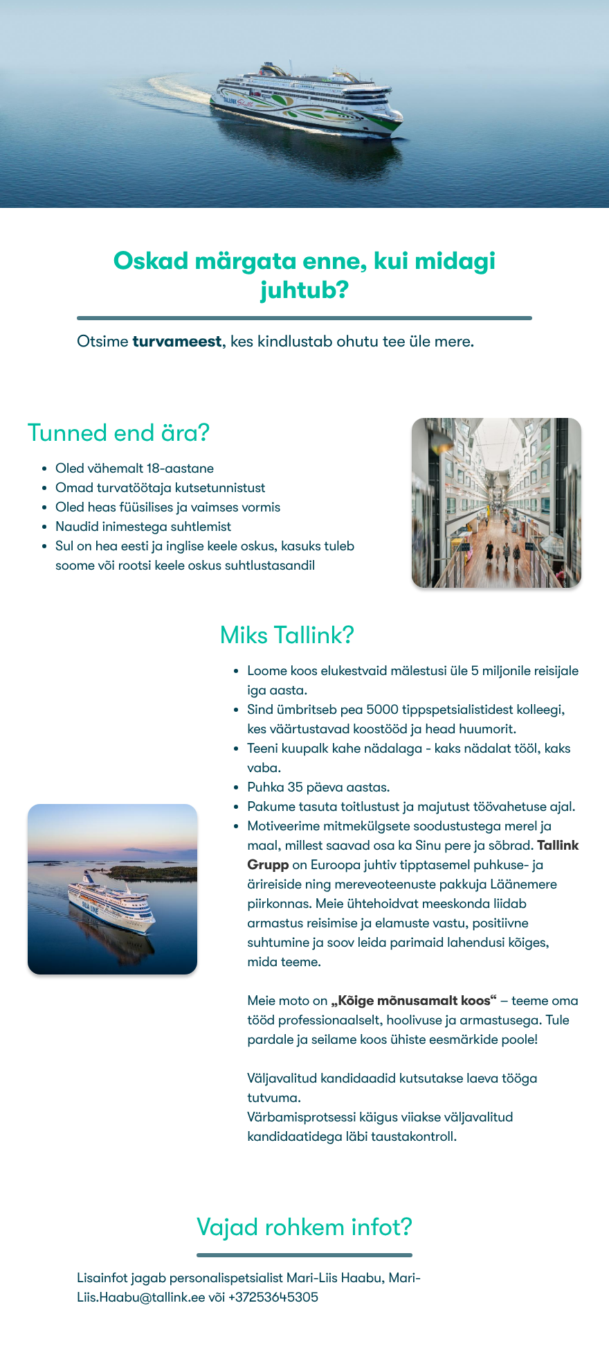 Tallink on Läänemere suurim ja edukaim reisilaevandusfirma. Tallink on Eesti hingega põhjamaine ettevõte, mis on rahvusvahelise kontsernina esindatud Eestis, Soomes, Rootsis, Lätis ja Saksamaal. Laevanduse kõrval on meil aastakümnete pikkune kogemus nii hotellinduses, jaekaubanduses, meelelahutuses, restoraniäris ja muuski. Äritegevuses seame esikohale jätkusuutlikkuse ning peame oluliseks mööndusteta kvaliteeti.