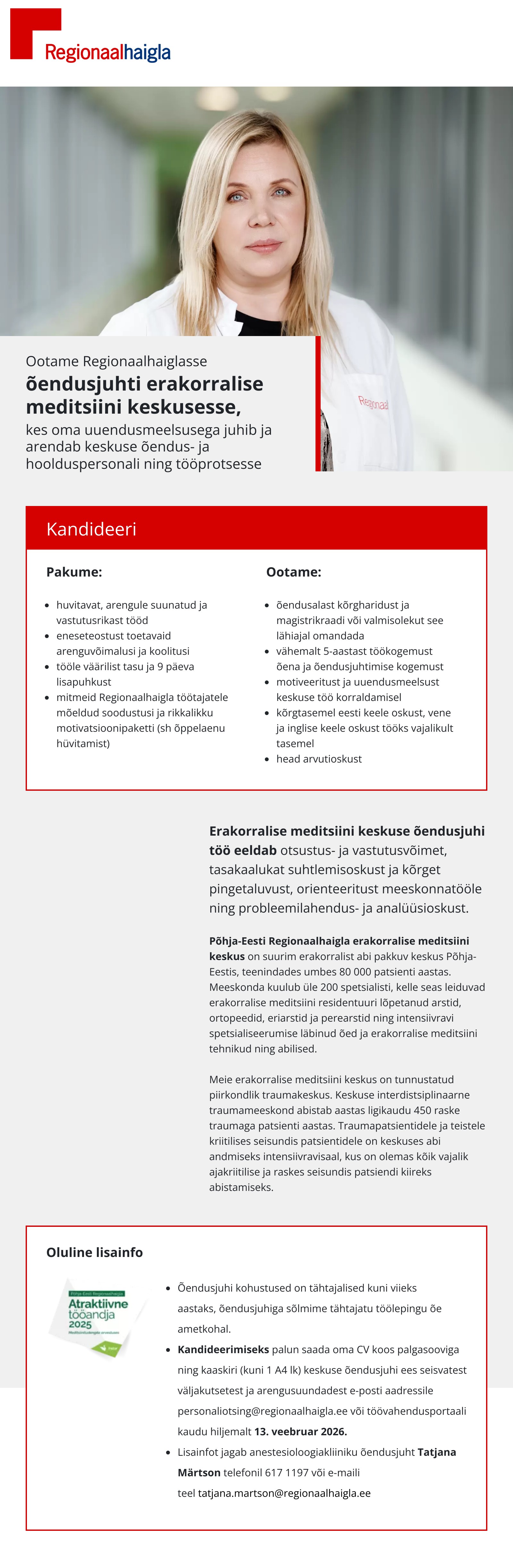 OotPõhja-Eesti Regionaalhaigla on piirkondlik haigla, mille ülesandeks on olla elanike arstliku turvalisuse tagaja ning kompetentsikeskus Põhja-Eesti haiglavõrgustikule ja tervishoiusüsteemile. Regionaalhaigla koosseisus on seitse kliinikut, kuhu kuuluvad 32 kõrgetasemelist erialakeskust ning töötab enam kui 4000 inimest. Regionaalhaigla on Eesti suurim traumakeskus, Põhja-Eesti suurim südamekeskus ja psühhiaatriakeskus ning haiglas osutatakse laiapõhjalist vähiravi rohkem kui pooltele vähihaigetele Eestis.ame liituma assistenti naistehaiguste polikliinikusse ning pea-ja kaelakirurgia polikliinikusse