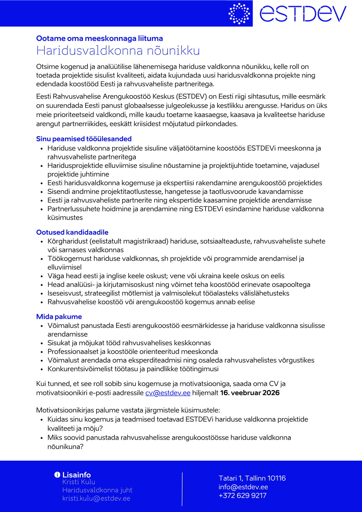 - Hea analüüsi- ja kirjutamisoskus ning võime anda sisulist ekspertnõu