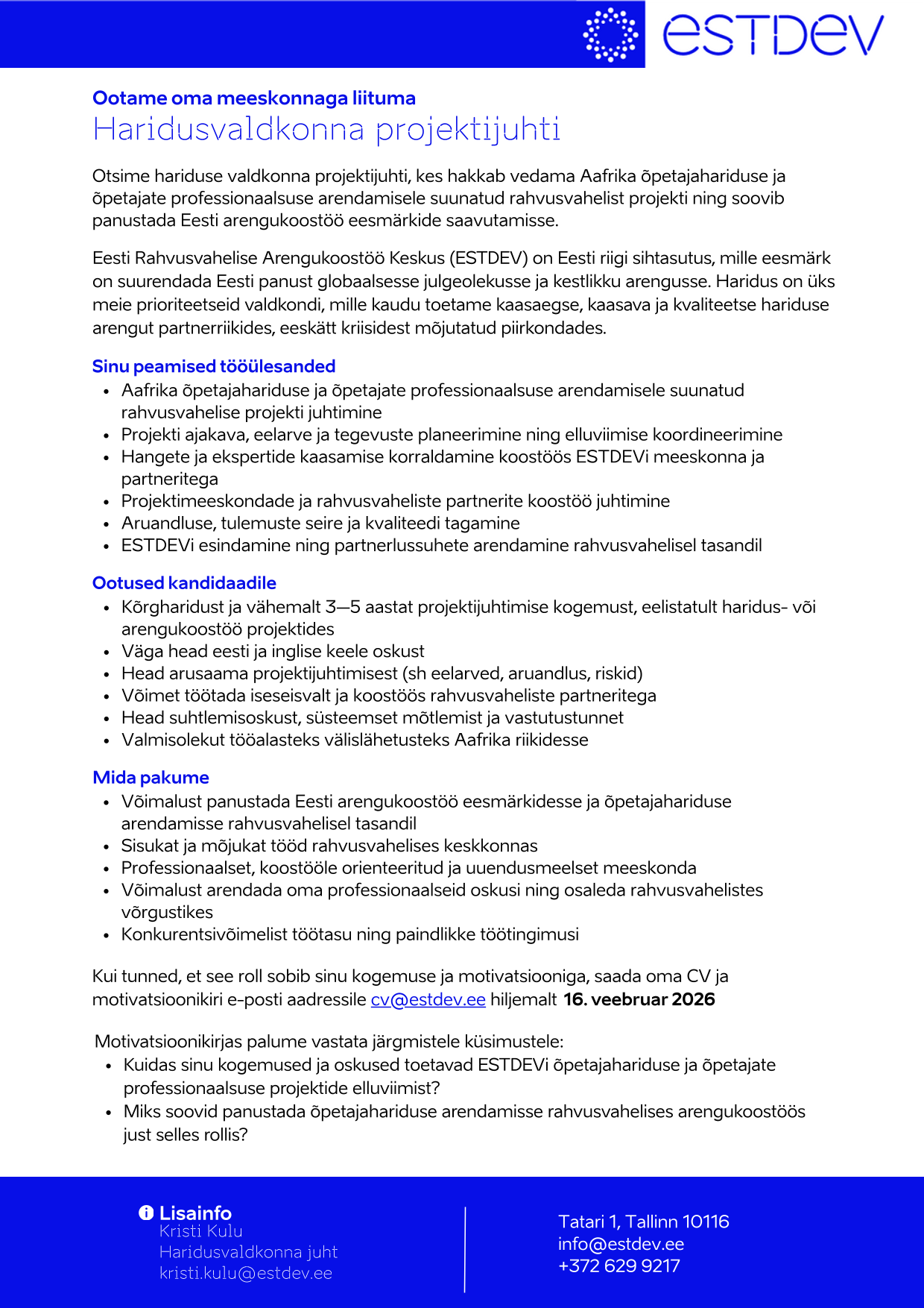 - Vähemalt 3–5 aastat projektijuhtimise kogemust, soovitavalt rahvusvahelise arengukoostöö või haridusprojektide valdkonnas