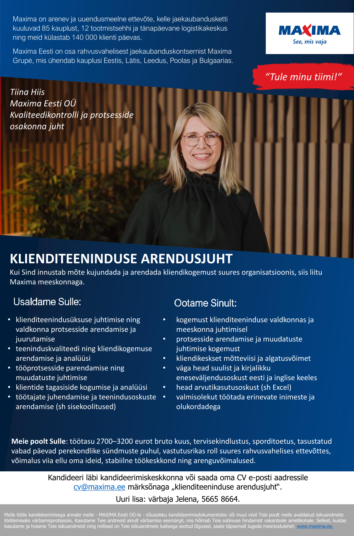 ning meid külastab 140 000 klienti päevas. Maxima Eesti on osa rahvusvahelisest jaekaubanduskontsernist Maxima Grupė, mis ühendab kauplusi Eestis, Lätis, Leedus, Poolas ja Bulgaarias.