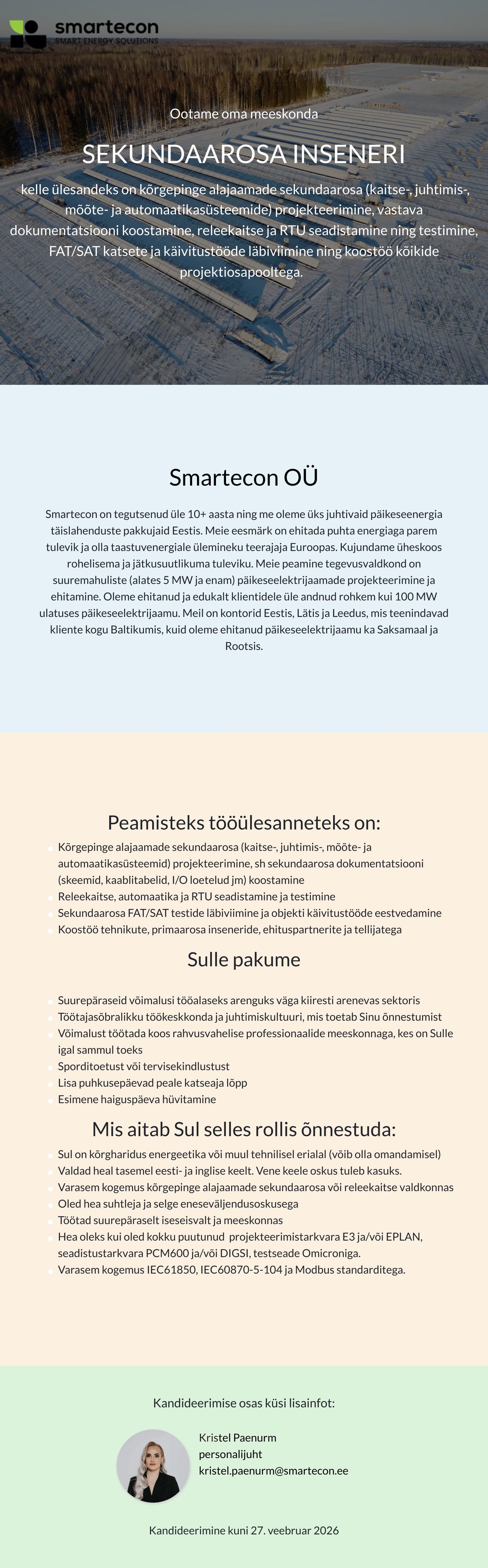Smartecon on 2012. a asutatud üks juhtivaid päikeseenergia täislahenduste pakkujaid Eestis. Meie eesmärk on ehitada puhta energiaga parem tulevik ja olla taastuvenergiale ülemineku teerajaja Euroopas. Kujundame üheskoos rohelisema ja jätkusuutlikuma tuleviku.Meie peamine tegevusvaldkond on suuremahuliste (alates 5 MW ja enam) päikeseelektrijaamade projekteerimine ja ehitamine. Oleme ehitanud ja edukalt klientidele üle andnud rohkem kui 100 MW ulatuses päikeseelektrijaamu. Meil on kontorid Eestis, Lätis ja Leedus, mis teenindavad kliente kogu Baltikumis, kuid oleme ehitanud päikeseelektrijaamu ka Saksamaal ja Rootsis. Loe meie kohta rohkem smartecon.ee