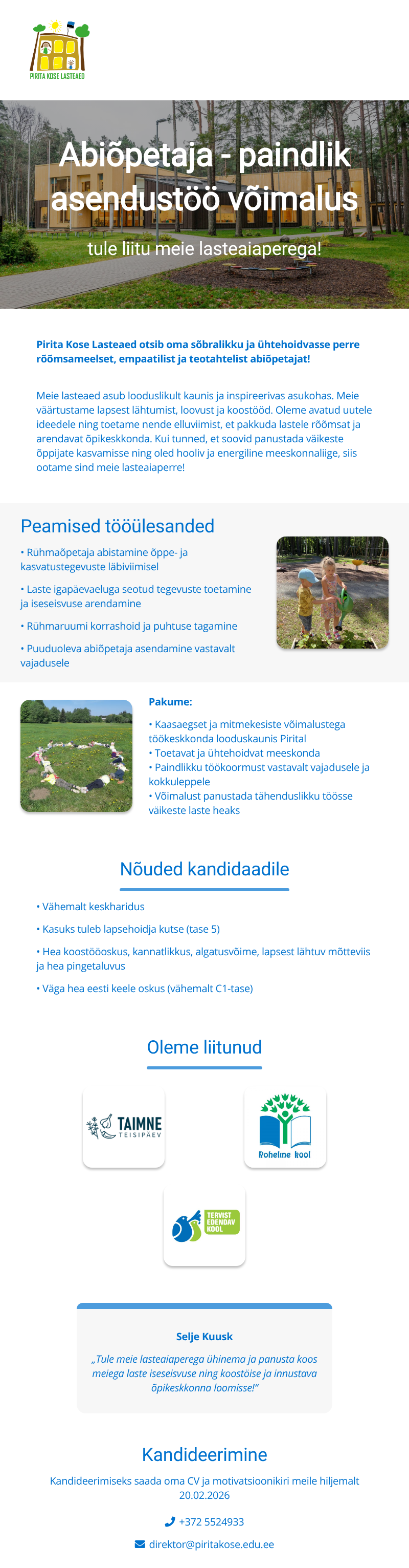 Pirita Kose Lasteaed otsib rõõmsameelset ja hoolivat abiõpetajat asendajaks.