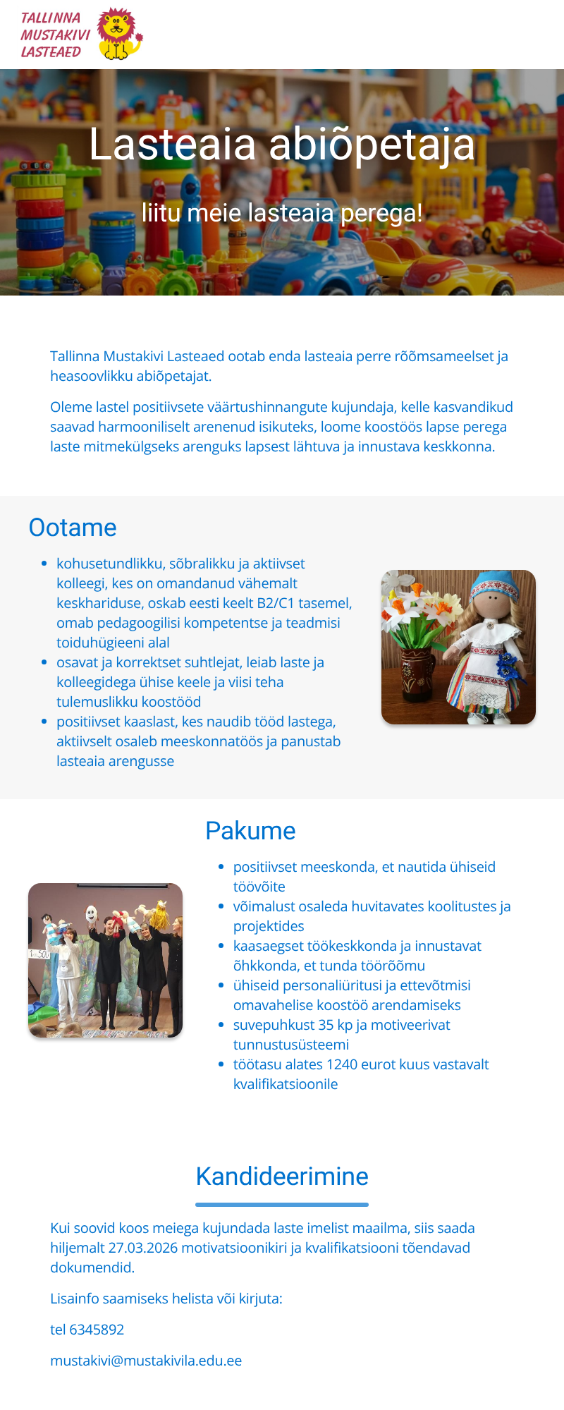Tallinna Mustakivi Lasteaed on kogukonnas väärtustatud lasteasutus kui lastel positiivsete väärtushinnangute kujundaja ning kelle kasvandikud