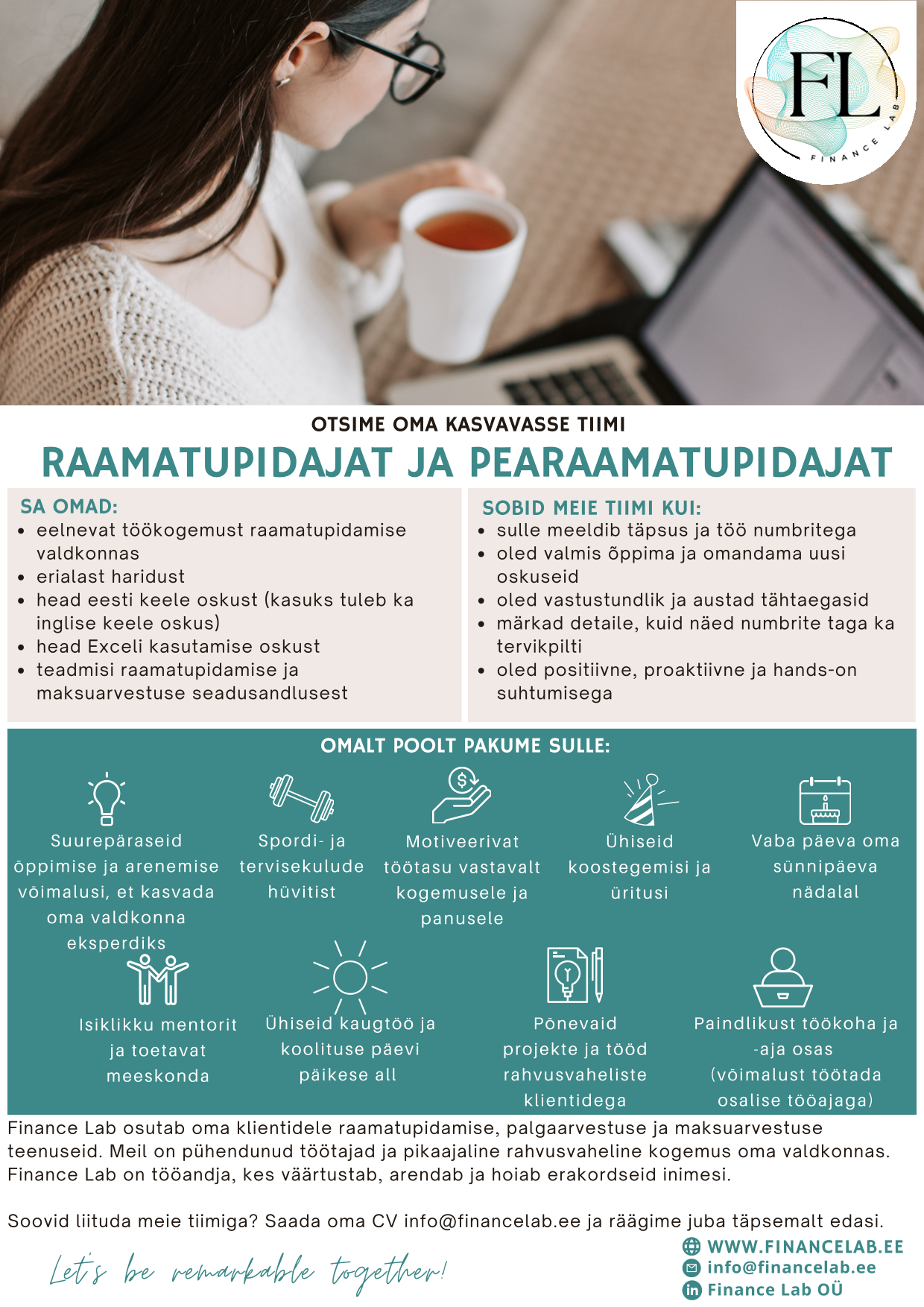 Finance Lab on tööandja, kes väärtustab oma inimesi, panustab nende arengusse ning loob keskkonna, kus erakordsed talendid saavad kasvada ja püsida. Meie raamatupidamisbüroo kuulub nende väheste hulka, kellele Eesti Raamatupidajate Kogu (ERK) on omistanud kvaliteedimärgi ja kes on lisaks pälvinud Äripäev TOP ettevõtte sertifikaadi.