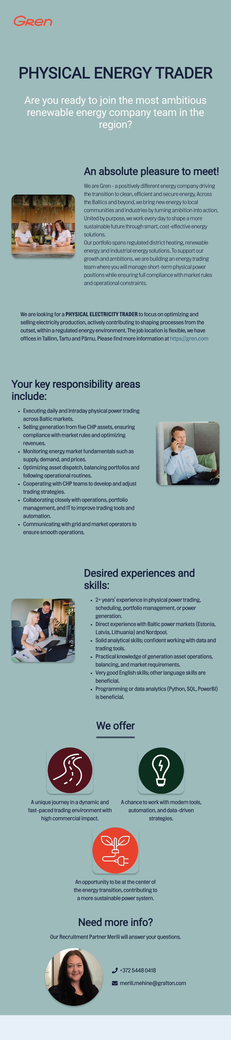 We are looking for a PHYSICAL ELECTRICITY TRADER to focus on optimizing and selling electricity production, actively contributing to shaping processes from the outset, within a regulated energy environment. The job location is flexible, we have offices in Tallinn, Tartu and Pärnu. Please find more information at https://gren.com