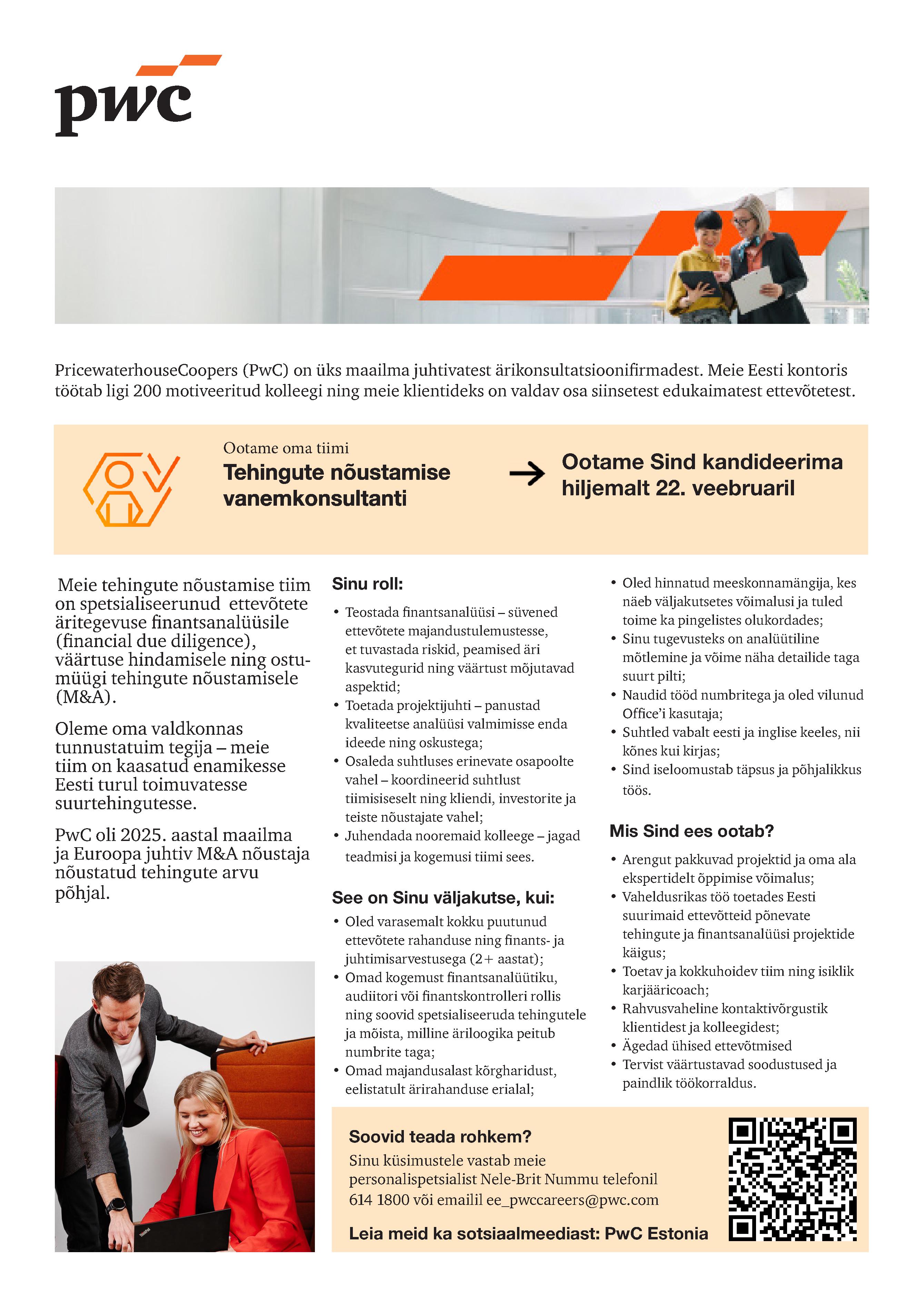 PricewaterhouseCoopers (PwC) on juhtiv audiitor- ja ärikonsultatsioonifirma, kuhu kuulub 228 000 töötajat 157 riigis. Eesti PwC-s töötab 220+ inimest ning meie klientideks on valdav osa siinsetest edukaimatest ettevõtetest (sh auditeerime 2/3 Tallinna Börsil noteeritud firmadest). Eestis tegutseme alates 1992. aastast. Kui Sulle on olulised tõeliselt suurepärased isikliku arengu võimalused ning toetavad ja positiivsed kolleegid, siis oled oodatud meie meeskonda!