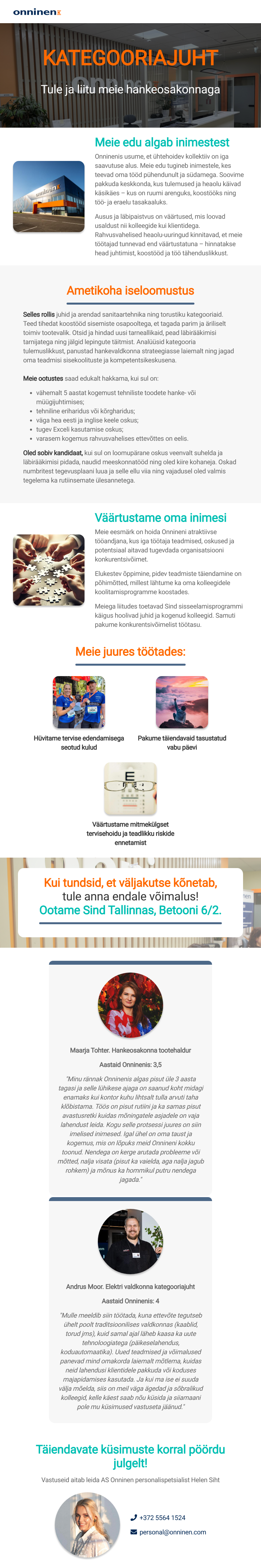 AS Onninen on tehniliste kaupade hulgimüügi ettevõte, mis pakub kaupu ja tootelahendusi elektri-, kütte-, veevarustuse, kanalisatsiooni-, ventilatsiooni-, jahutuse- ja külmatehnika valdkonna professionaalidele. Laiaulatuslik tootelahenduste valik on leitav ka meie e-poes - www.onninen.ee Kuulume rahvusvahelisse Kesko Group´i, ehituse ning tehnilise kaubanduse divisjoni. Divisjon tegutseb kaheksas riigis ja selles töötab ligikaudu 17 000 kaubandussektori spetsialisti. Meie tegevus põhineb kindlatel väärtustel ja pikaajalistel eesmärkidel. AS Onninen on atraktiivseks tööandjaks ca 180-le inimesele, üle Eesti on meil avatud 8 esindusüksust - Onninen Expressi ja Logistikakeskus Lagedil. Vaata lähemalt: www.onninen.ee Vaata meie tooteid kodulehel e-poes Onnshop: https://www.onninen.ee või tutvu meie esindustega läbi Facebooki: https://www.facebook.com/Onninen-Eesti-1501572700056964 või LinkedIni: https://www.linkedin.com/company/onninen-eesti