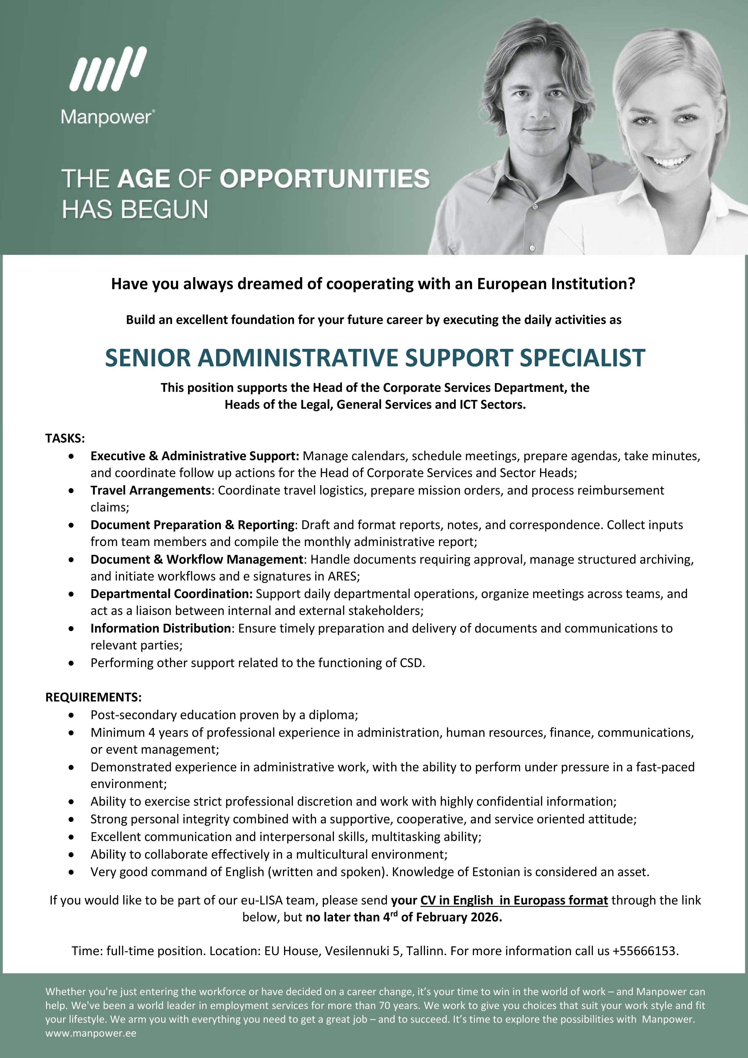 Manpower on üks tunnustatumaid personaliettevõtteid maailmas. Meil on üle 75 aasta rahvusvahelist kogemust töötajate värbamise ja renditeenuste alal. Me hoolime inimestest ja sellest, mis rolli mängib töö nende elus. Alates 2004.aastast oleme Eestis aidanud inimestel leida nende elu-ja tööstiiliga sobiva ametikoha. Sa alles sisened tööturule, otsid uusi väljakutseid või planeerid karjäärimuutust - meie Manpoweris oskame aidata. Unistuste töö leidmine on SINU võimuses. www.manpower.ee
