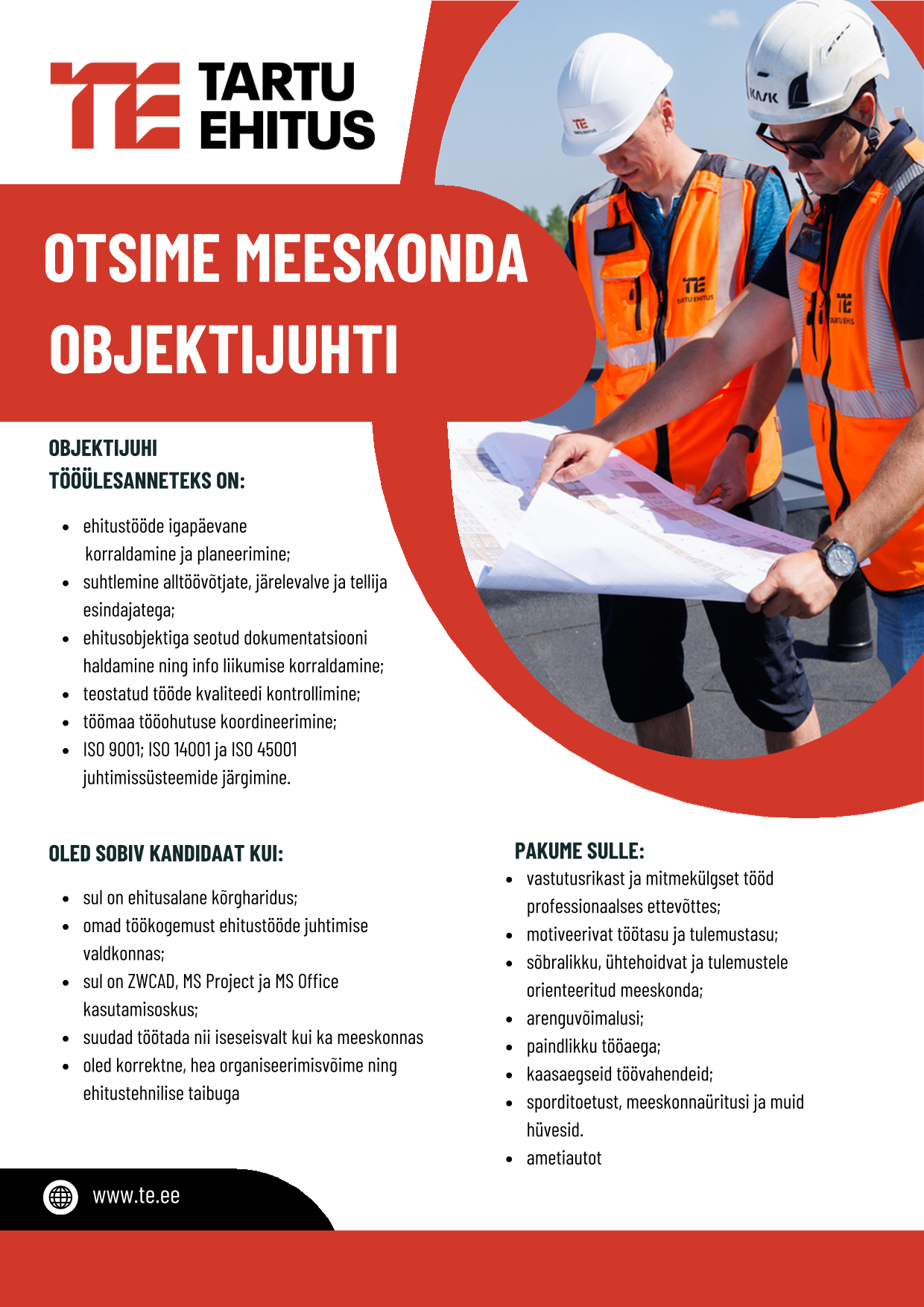 AS Tartu Ehitus on Teie usaldusväärne partner, pakkudes terviklikke ehituslahendusi alates esialgse idee vormimisest kuni hoone valmimiseni. Meie enam kui 33-aastane kogemus ehitustööde juhtimises on küll märgiline, kuid meie tegelik edu võti peitub ennekõike meie professionaalses kollektiivis. Meie meeskond, alates müügimeeskonnast kuni platsil tegutsevate projektijuhtideni, läheneb igale projektile erakordse põhjalikkuse ja pühendumisega, tagamaks Tellija ootustele vastava hoone valmimise.