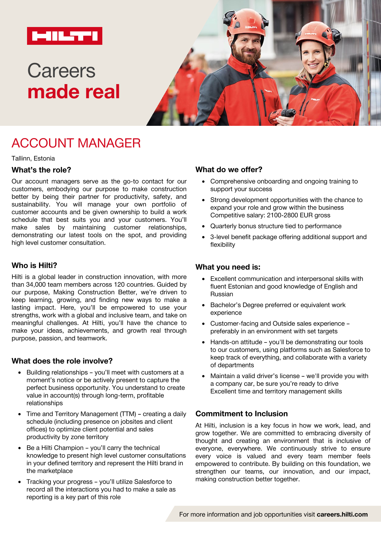 Hilti is a global leader in construction innovation, with more than 34,000 team members across 120 countries. Guided by our purpose, Making Construction Better, we’re driven to keep learning, growing, and finding new ways to make a lasting impact. Here, you’ll be empowered to use your strengths, work with a global and inclusive team, and take on meaningful challenges. At Hilti, you’ll have the chance to make your ideas, achievements, and growth real through purpose, passion, and teamwork.